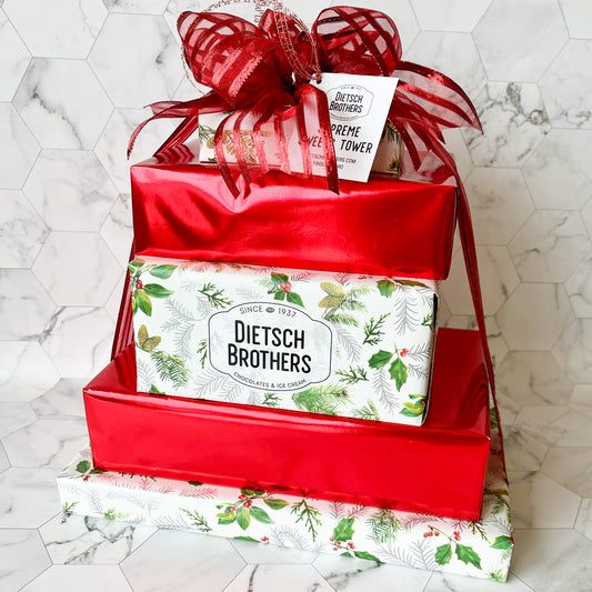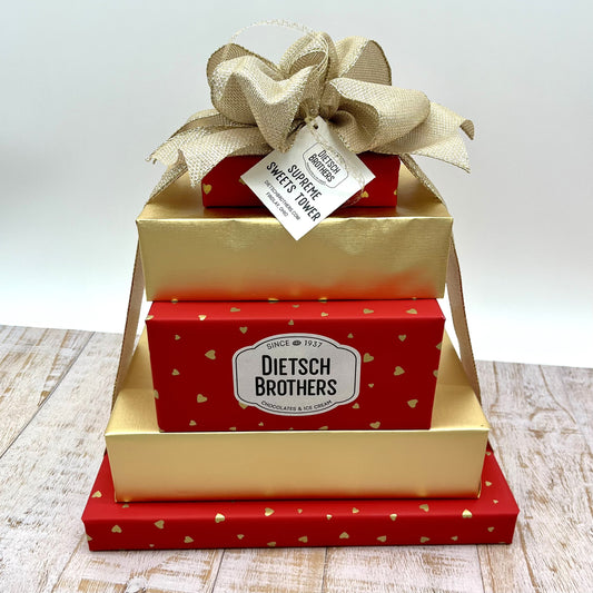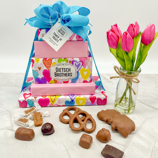 All gift boxes come with complimentary gift wrap and card messages. For a printable candy tower list, please click here.