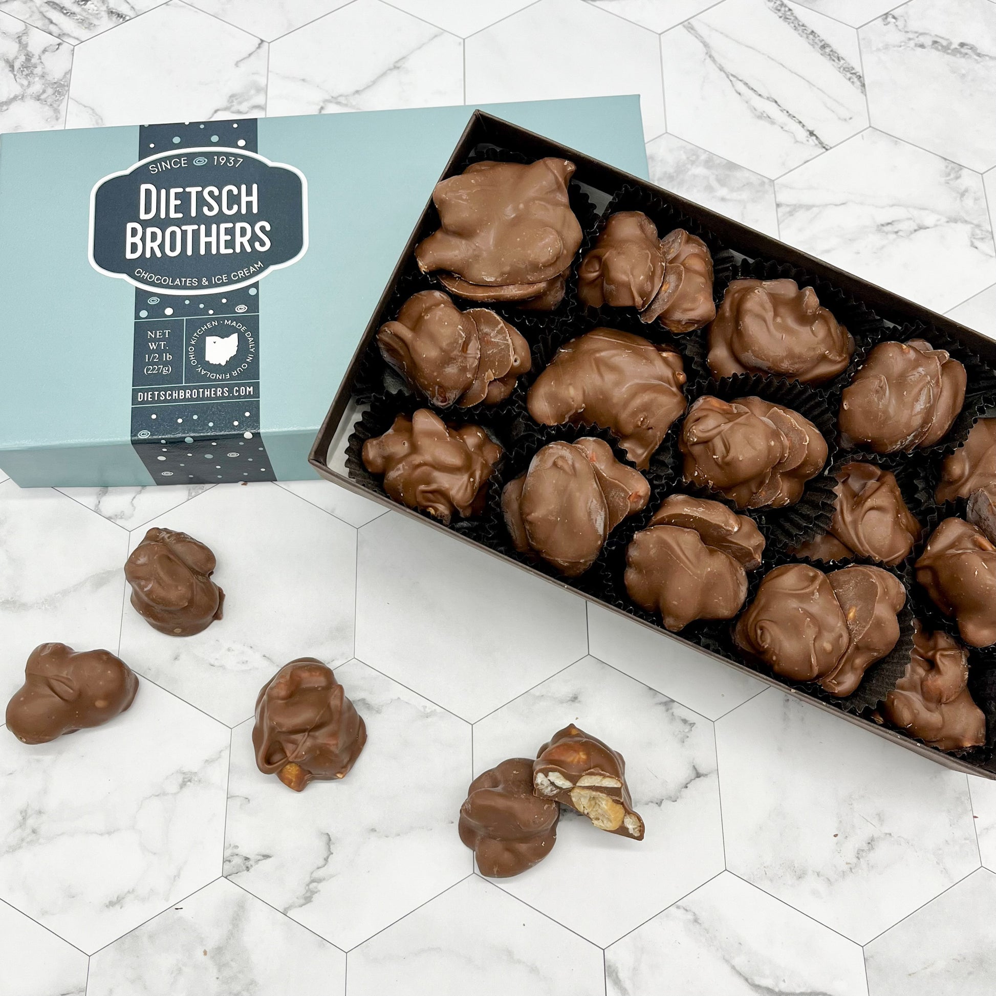 If you are a nut lover, this box is for you. Hand-dipped clusters of fresh-roasted almonds, cashews, pecans and hazelnuts coated in creamy milk and/or dark chocolate fill this box.