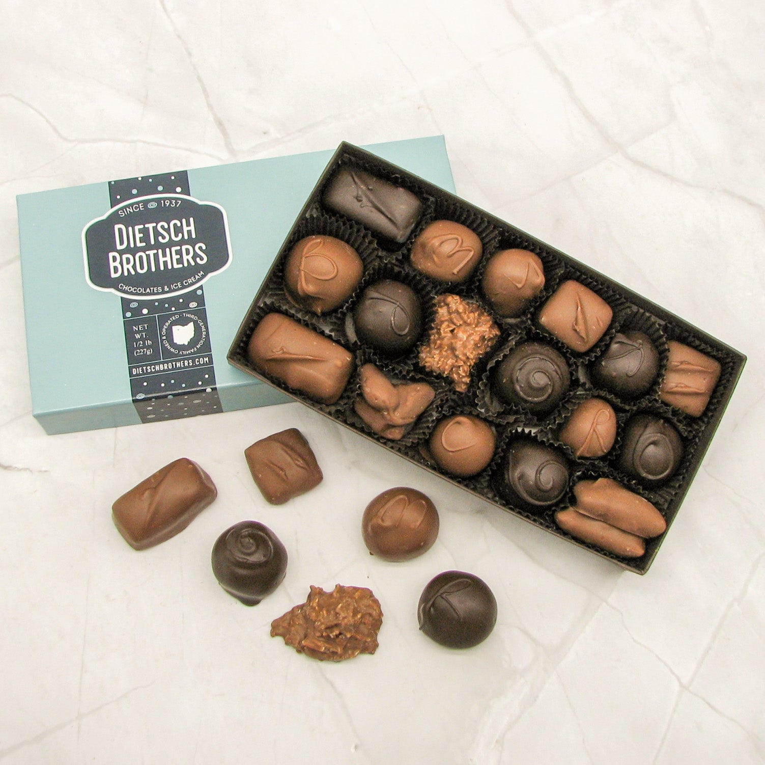 This popular box of candy offers a wonderful selection of creams, caramels, nougats, chips, toffee squares, nuts and other goodies in milk and dark chocolate.