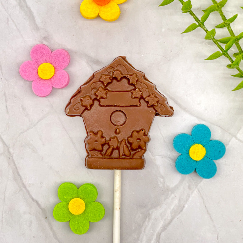 These solid milk chocolate suckers weigh .05 lb. and are 2.5" x 2.5" in size.