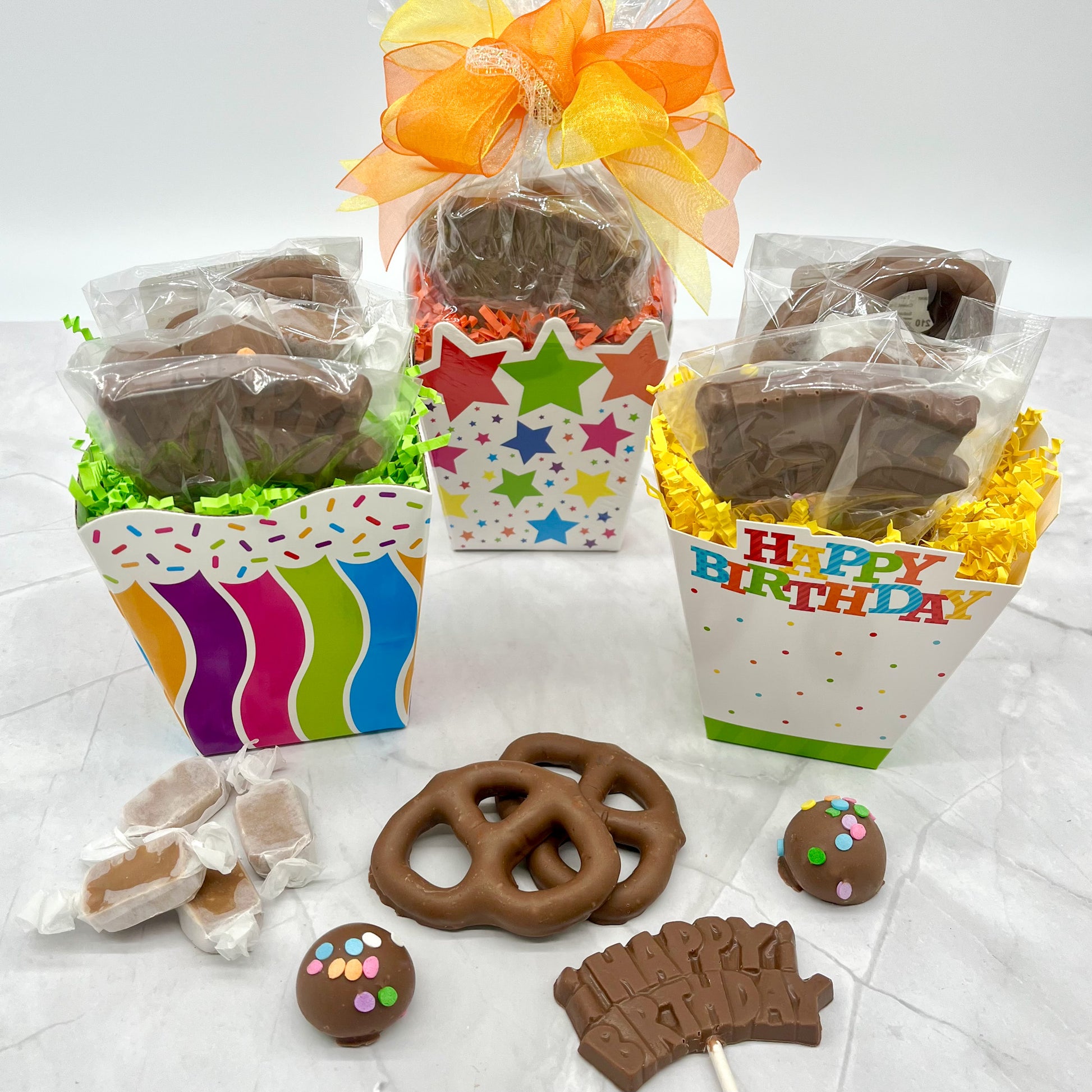 These new birthday boxes contain two milk pretzels, five wrapped caramels, four milk chocolate birthday cake truffles and a milk Happy Birthday sucker. Each gift box comes bagged up and tied with a fabric bow.