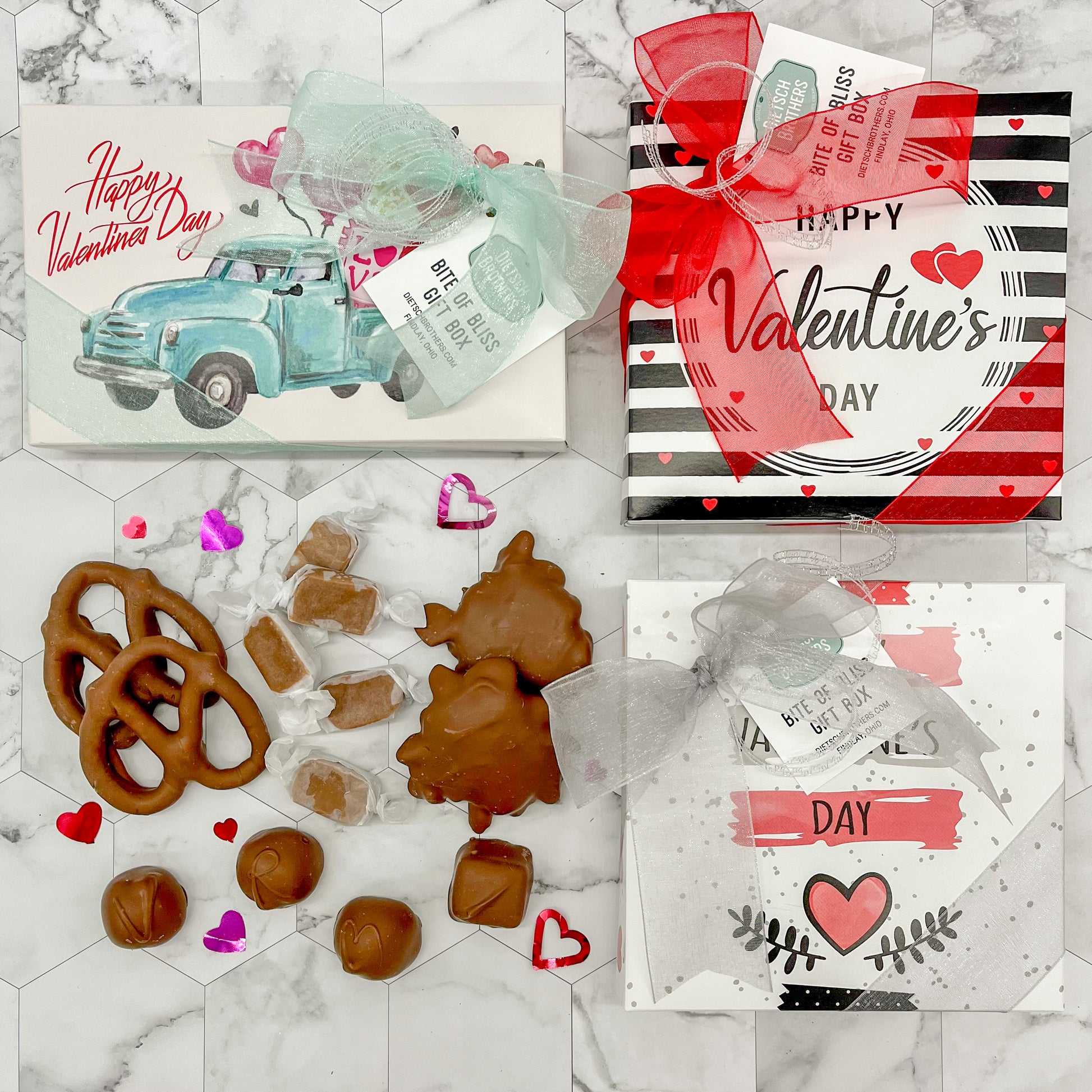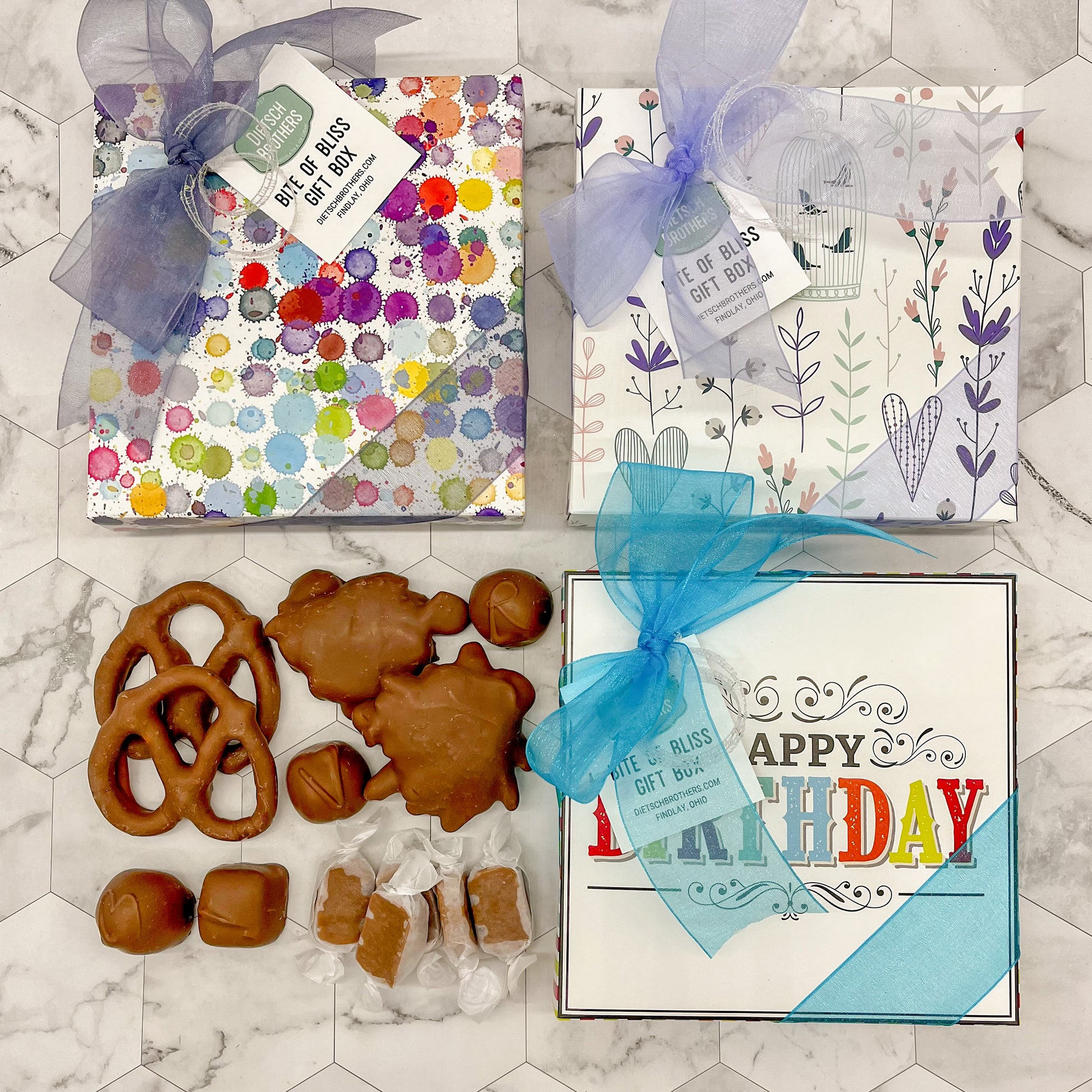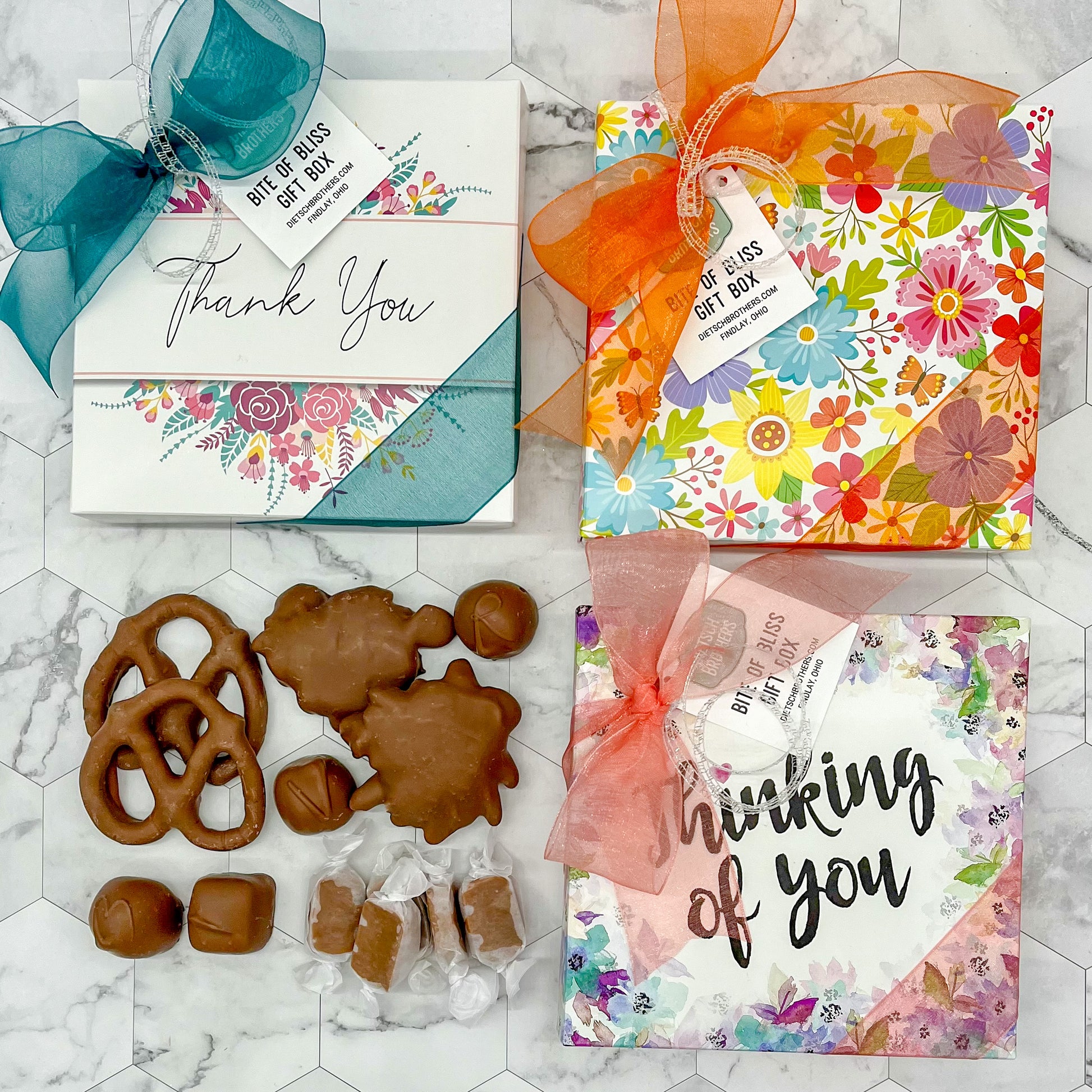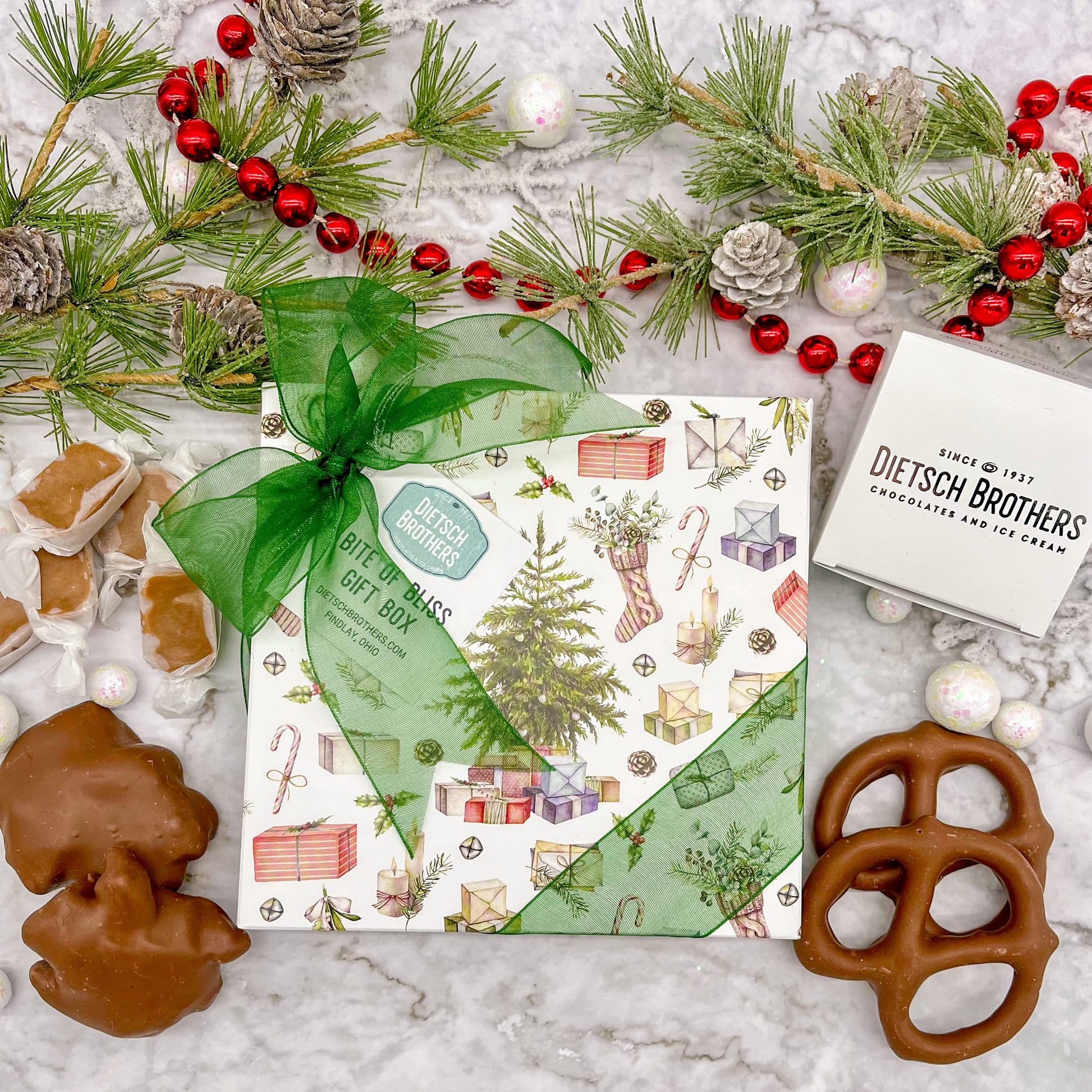 These little gift boxes are filled with some of our most popular items and are perfect for any occasion. Each box includes a four piece box of assorted chocolates, two milk chocolate pretzels, two milk pecan critters and five wrapped caramels.