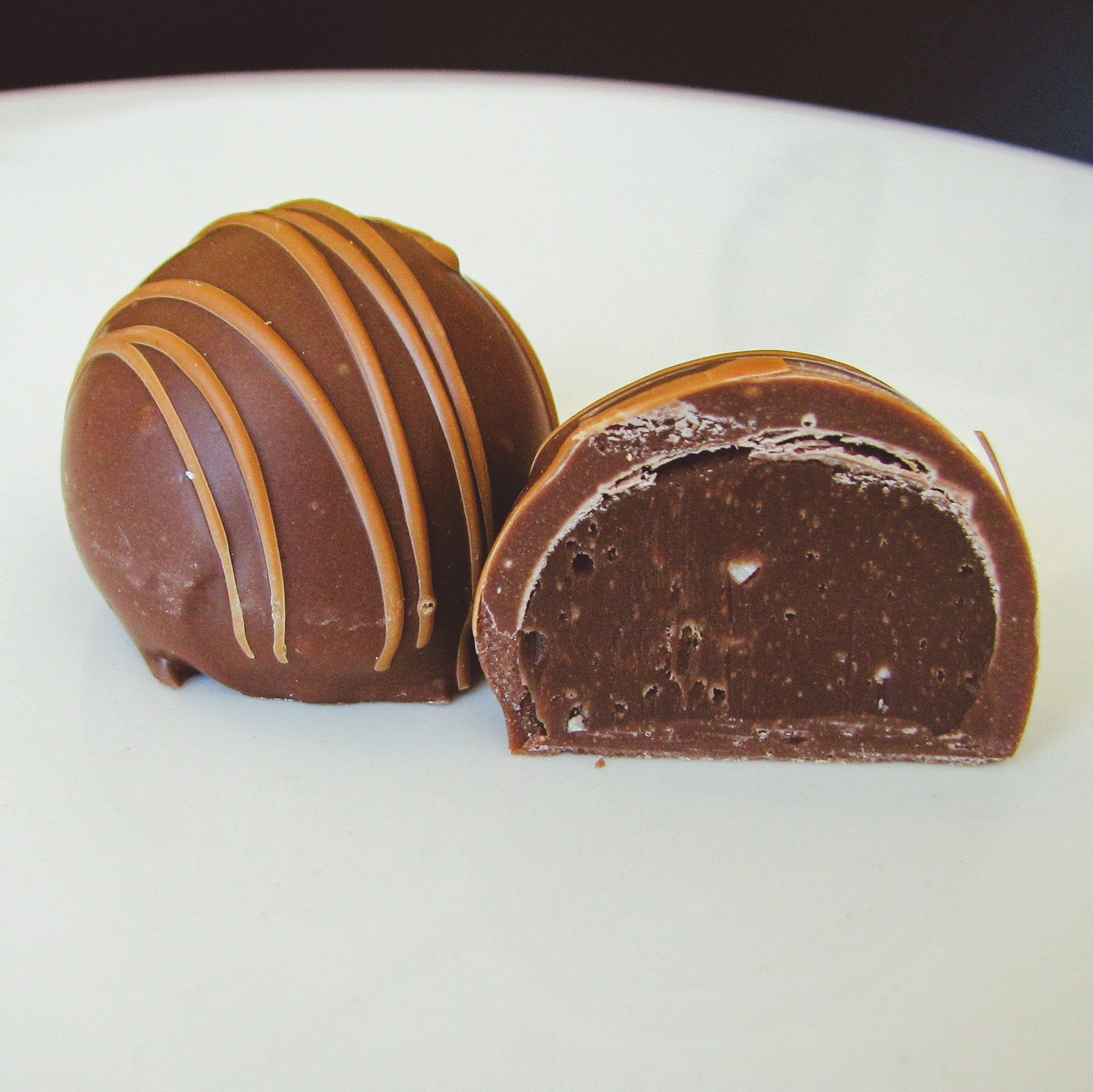 This summer truffle has a chocolate ganache center with some of our caramel ice cream base and shredded coconut mixed in. It is coated and drizzled in sweet milk chocolate.