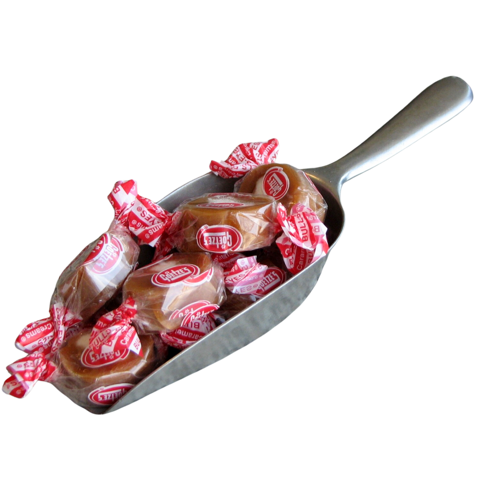 Also called Bullseye candies, these individually wrapped chewy caramels have a white vanilla cream filled center.