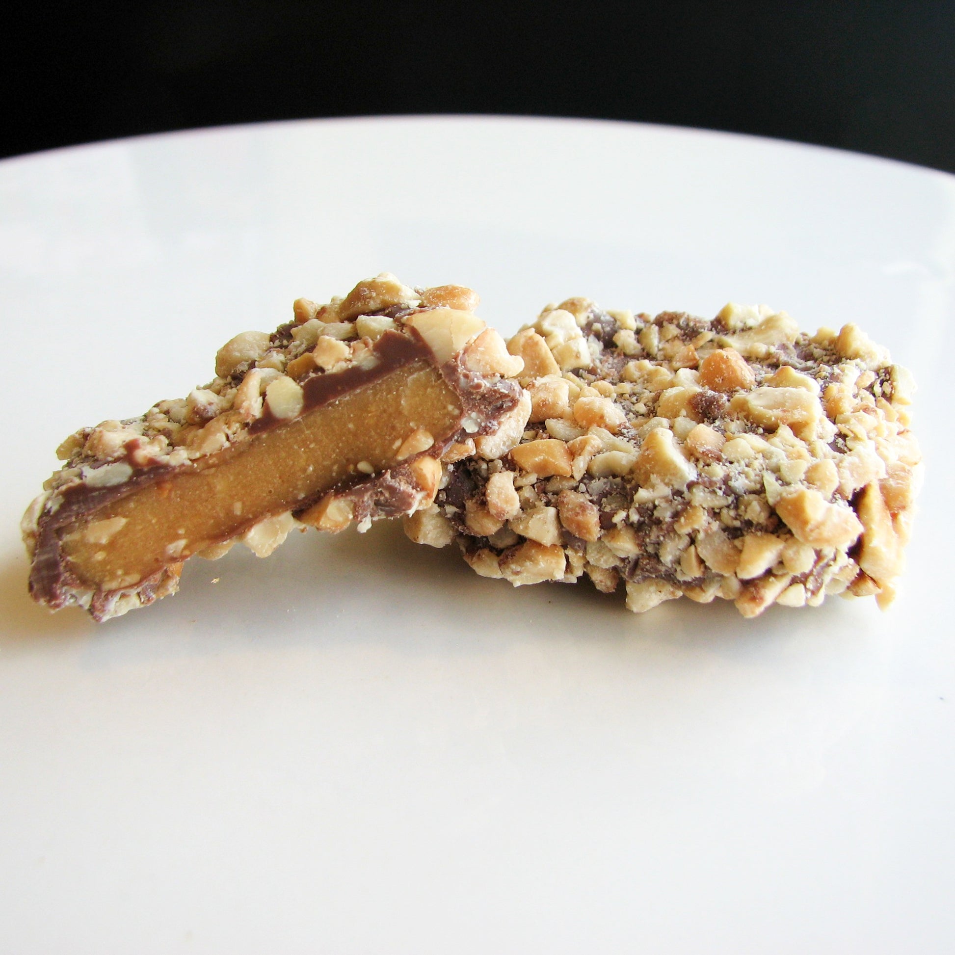 These square treats have a crunchy cashew toffee center that is coated in creamy milk chocolate and covered with roasted cashew pieces.
