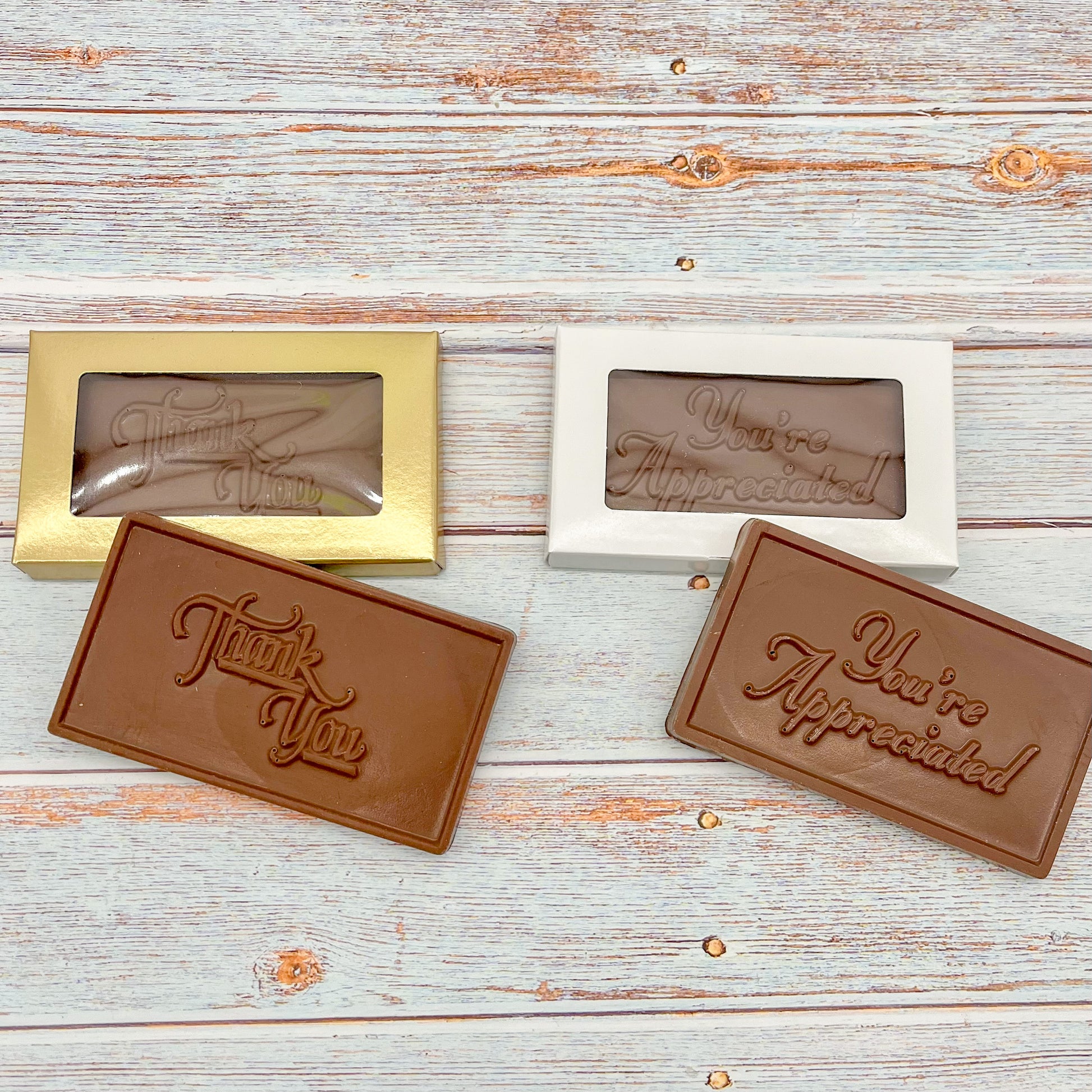 We have the perfect way for you to get your message across, say it with chocolate message bars that are the size of a business card. You can select from a wide array of message bars such as Thank You For Your Business, You're Appreciated, Happy Birthday, Get Well, etc. Each bar comes in either a gold or silver box.