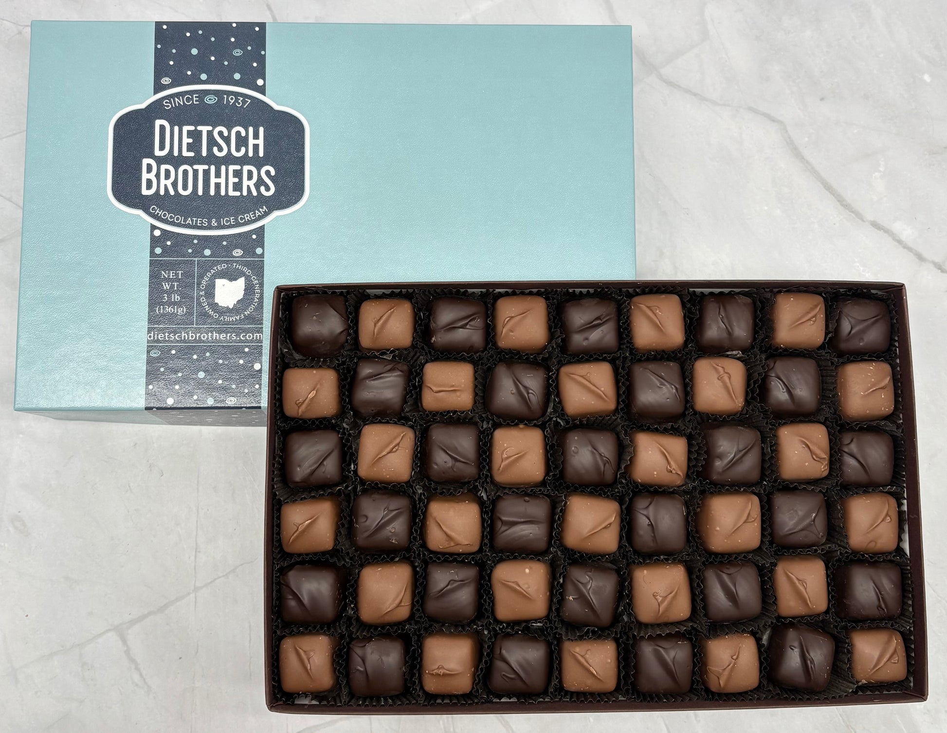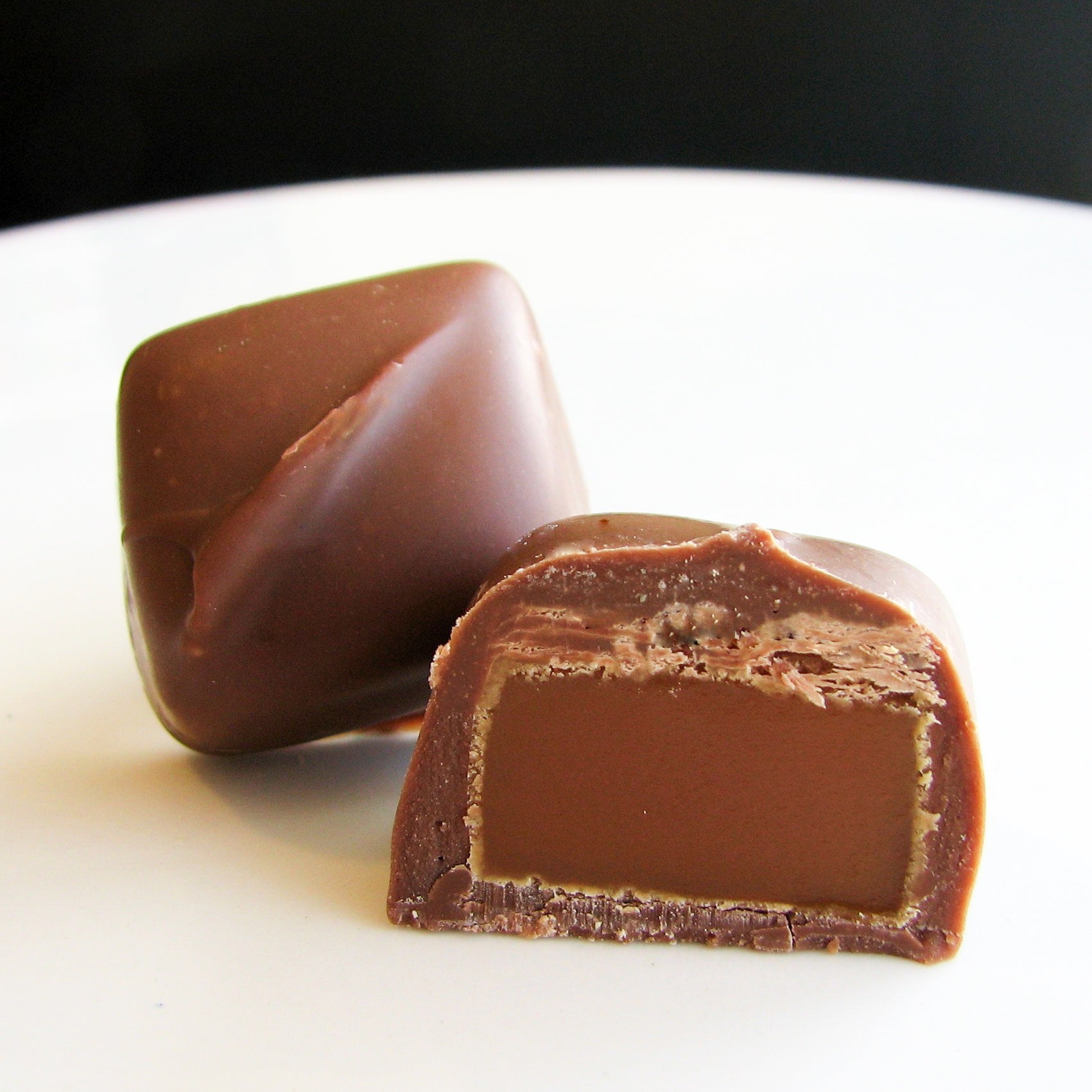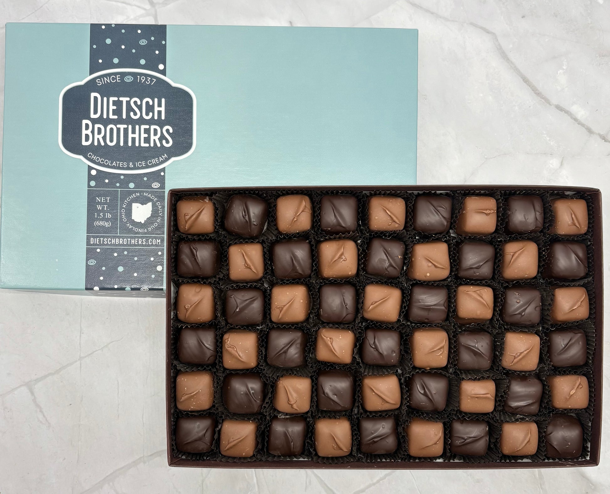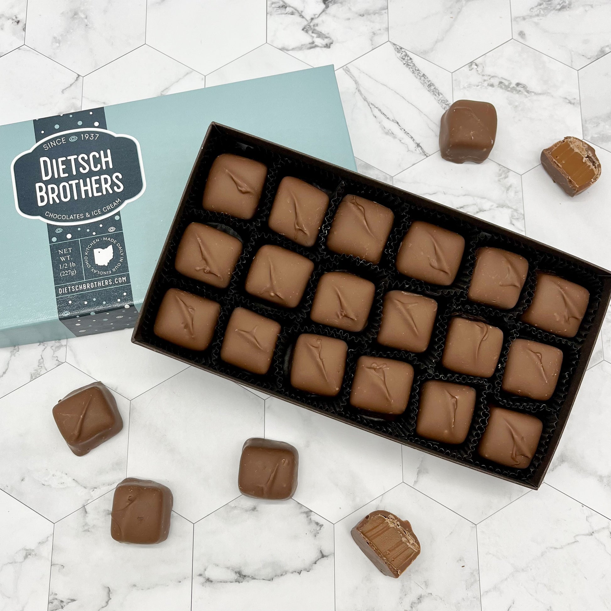 Using only the freshest ingredients, we cook an eighty-pound batch of caramel in one of our large copper kettles. After it is poured onto a table to cool, it is cut up into bite-size pieces and coated in creamy milk or dark chocolate.