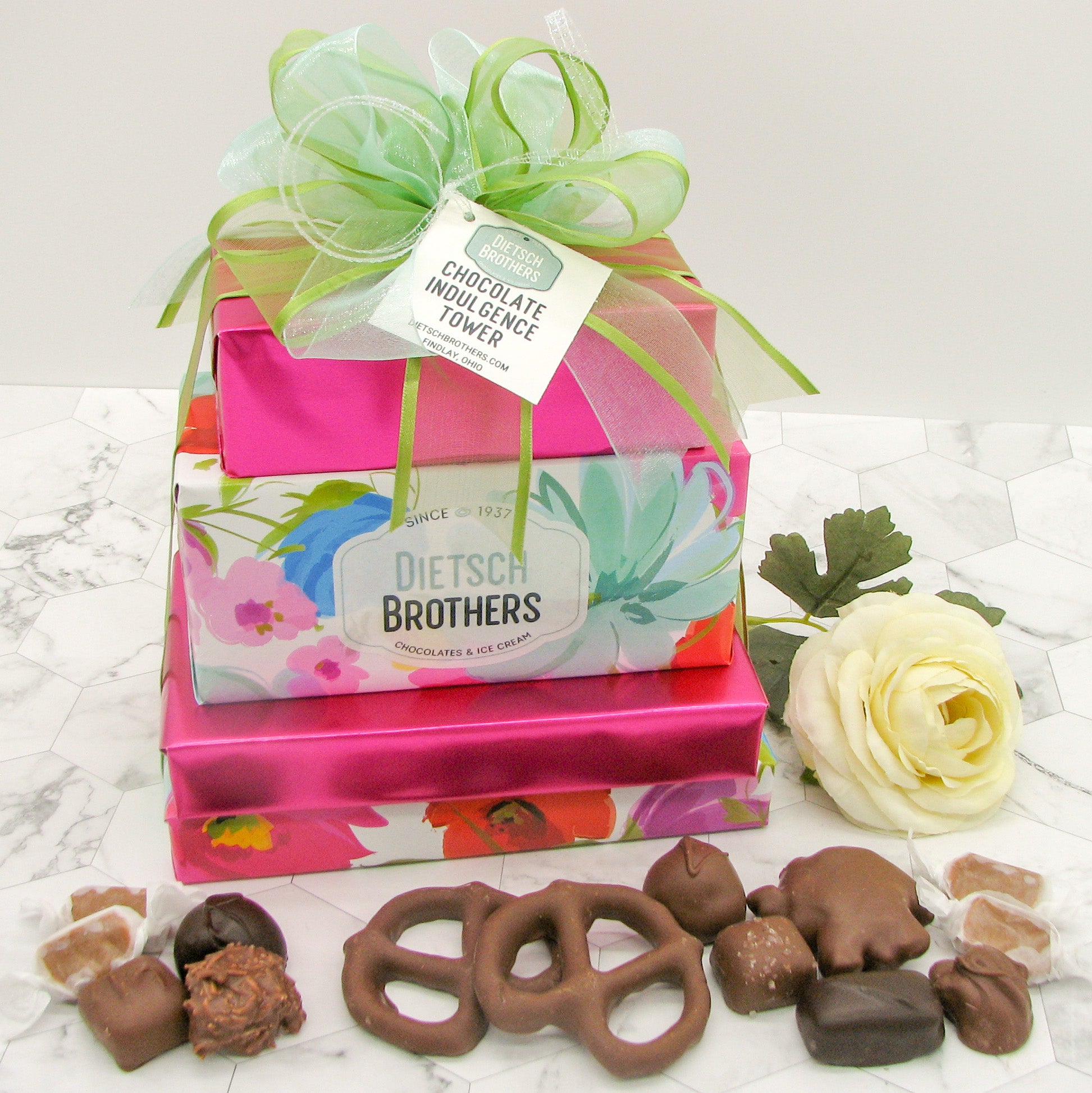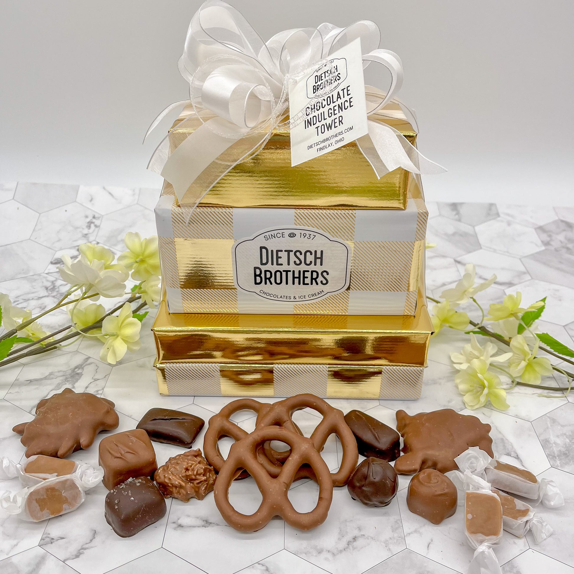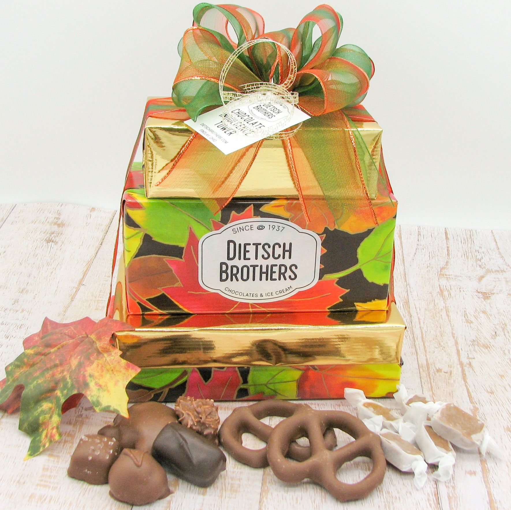 This gift tower contains a 1/2 lb. box of assorted chocolates, 1/2 lb. box of milk chocolate pecan critters, 1/2 lb. box of wrapped caramels and a 1/2 lb. box of milk chocolate pretzels. Gift wrap may vary from picture shown below.