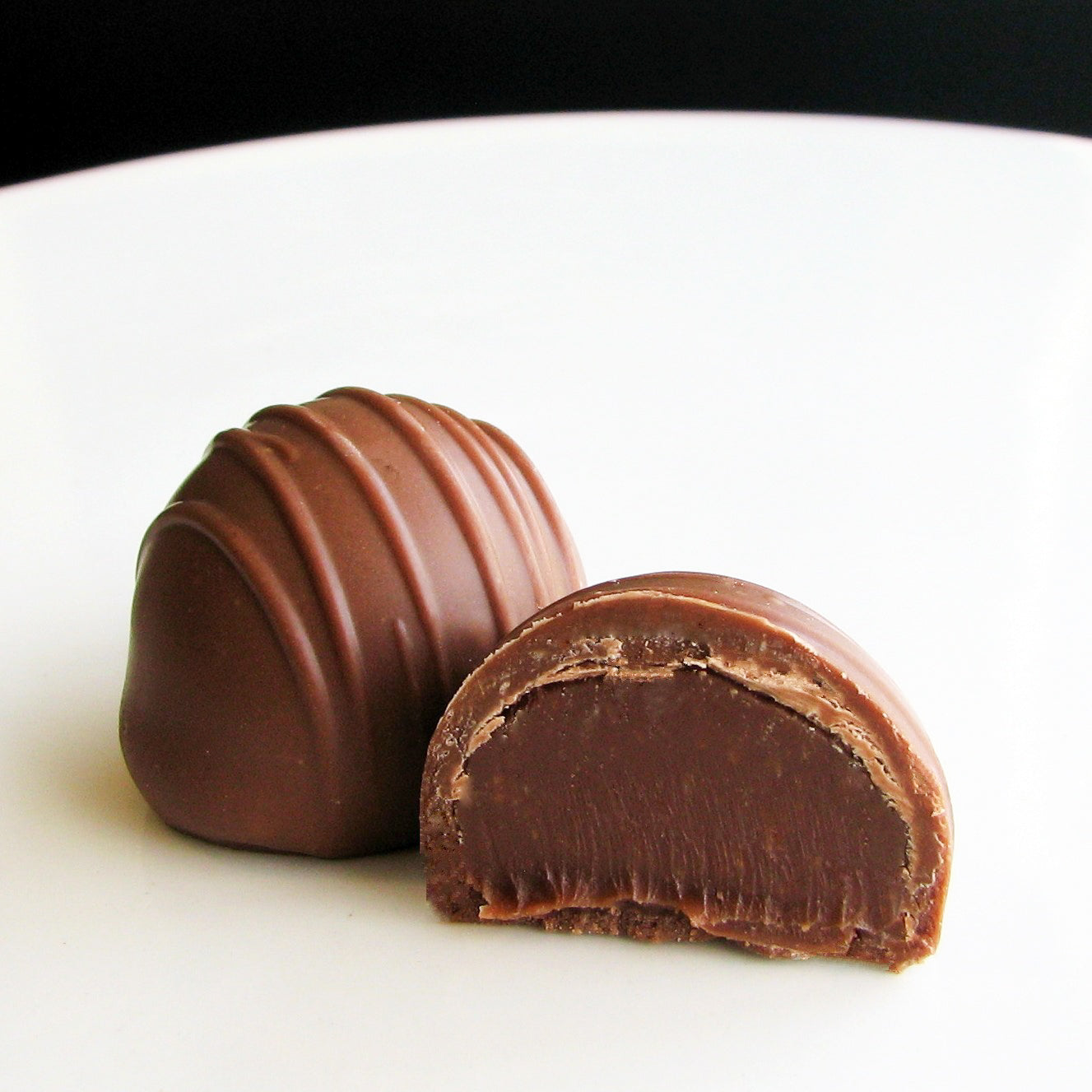 This milk chocolate coated truffle has a sweet milk chocolate frosting flavored center and milk chocolate drizzled on top of it.
