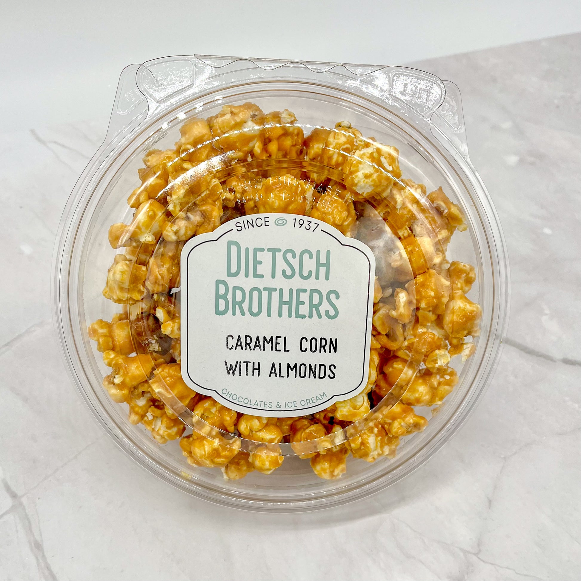 Each fresh batch of popcorn that we cook on site is mixed with roasted almonds and coated in our sweet caramel coating. Packaged in .40 lb. containers, our caramel corn makes a great snack or gift.