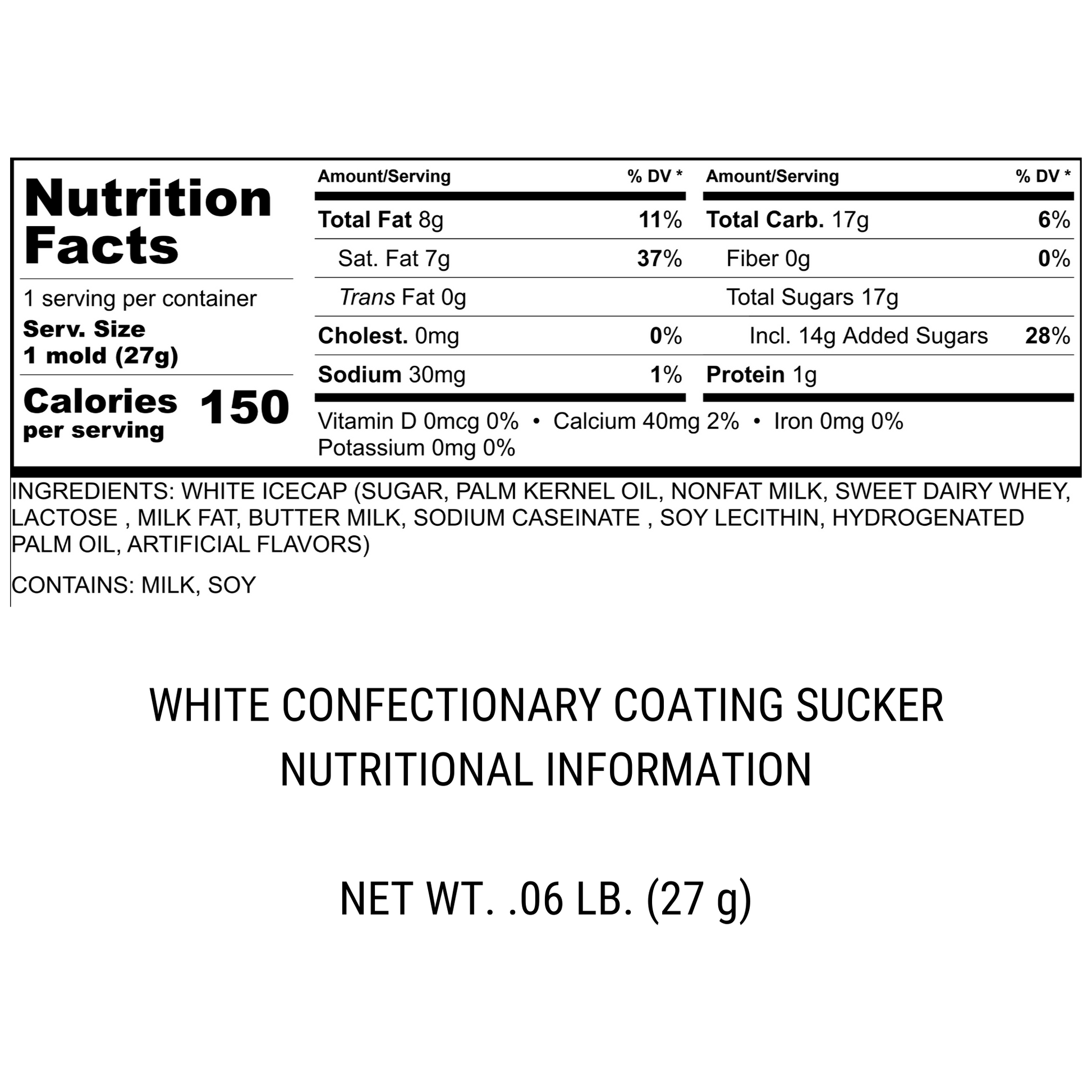 These solid chocolate suckers weigh .05 lb. and are 1.5" x 1.5" in size.