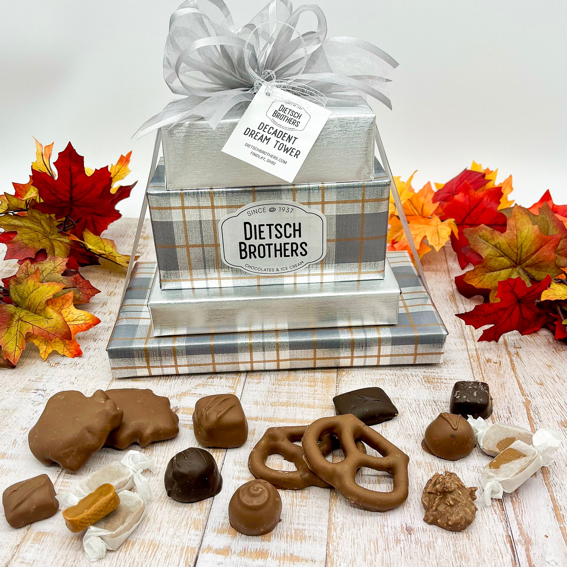 This gift tower contains a 1 lb. box of assorted chocolates, 1/2 lb. box of milk chocolate pecan critters, 1/2 lb. box of wrapped caramels and a 1/2 lb. box of milk chocolate pretzels. Gift wrap may vary from picture shown below.