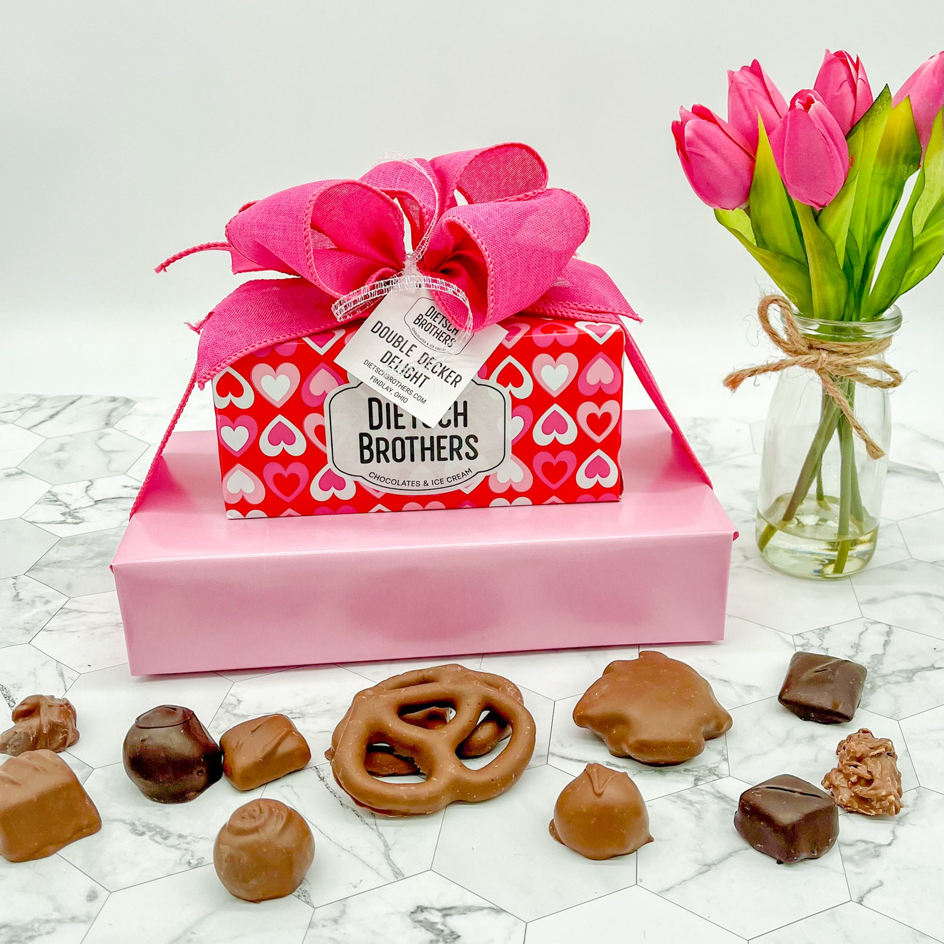 This gift tower contains a 2 lb. box of assorted chocolates and a 1/2 lb. box of milk chocolate pretzels. Gift wrap may vary from picture shown below.
