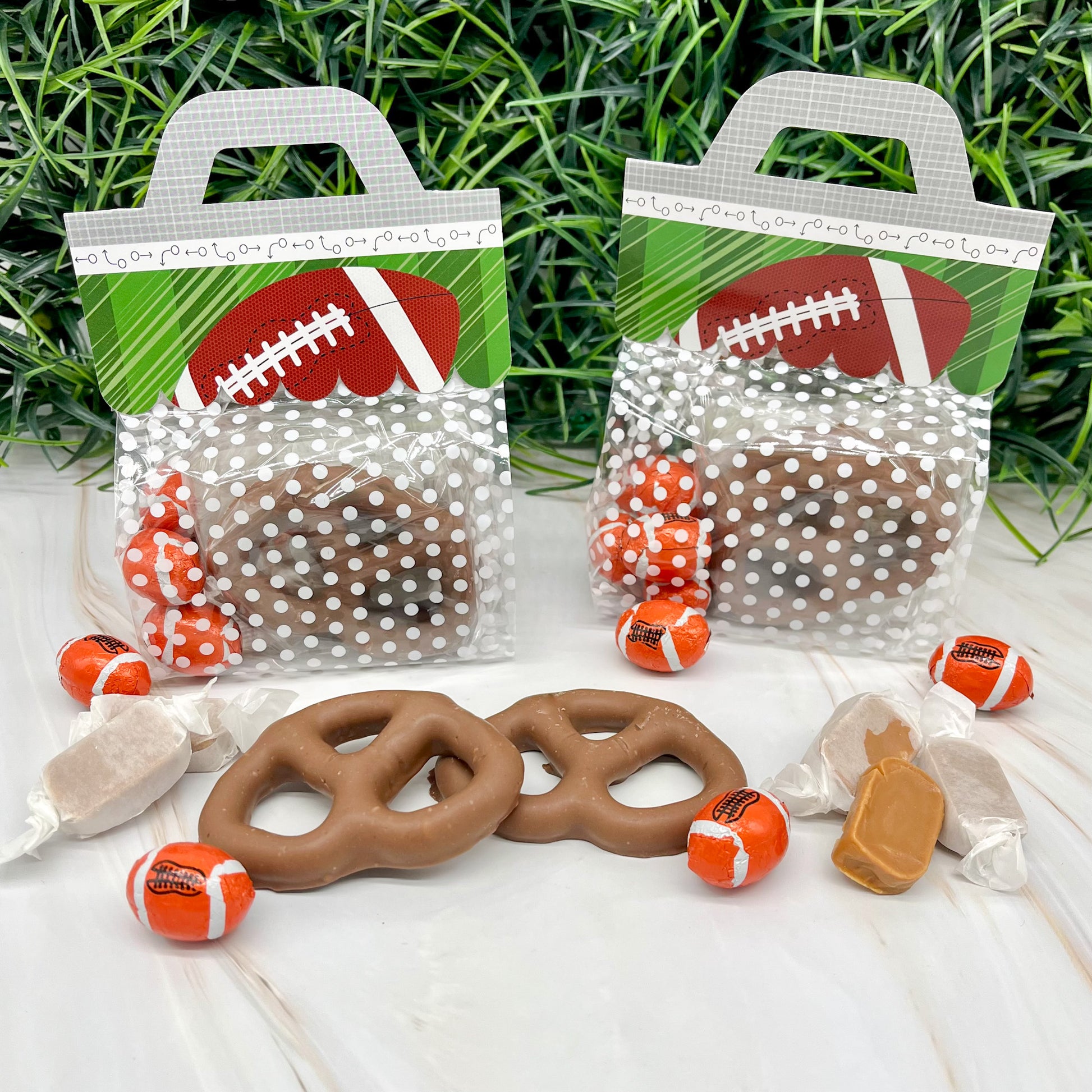 These new little gift bags contain two milk pretzels, five wrapped caramels and six foiled milk chocolate footballs. On the back of the bag tags is a place for you to write who the gift is to and from.