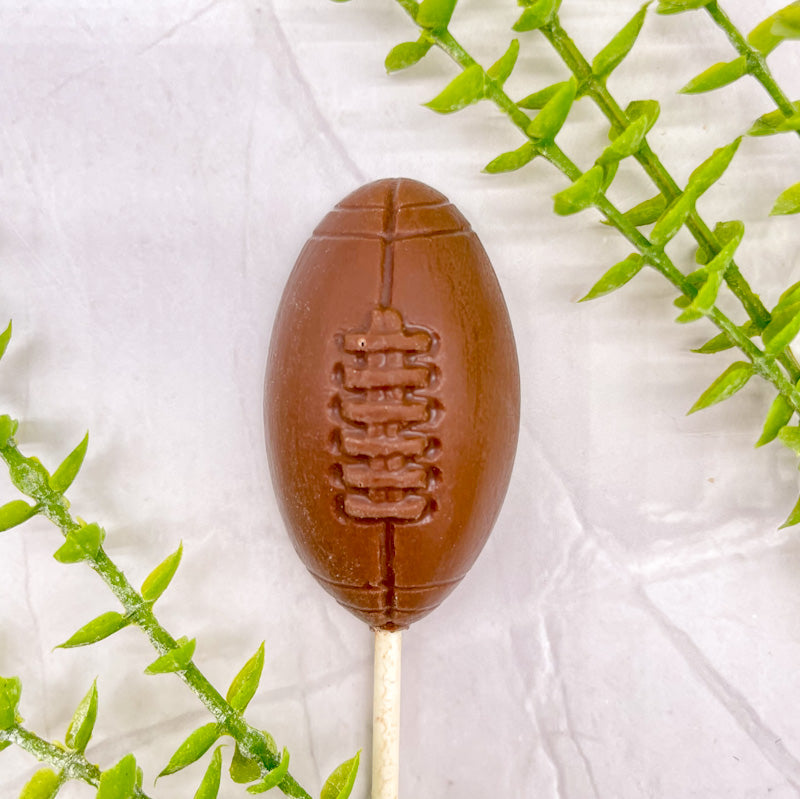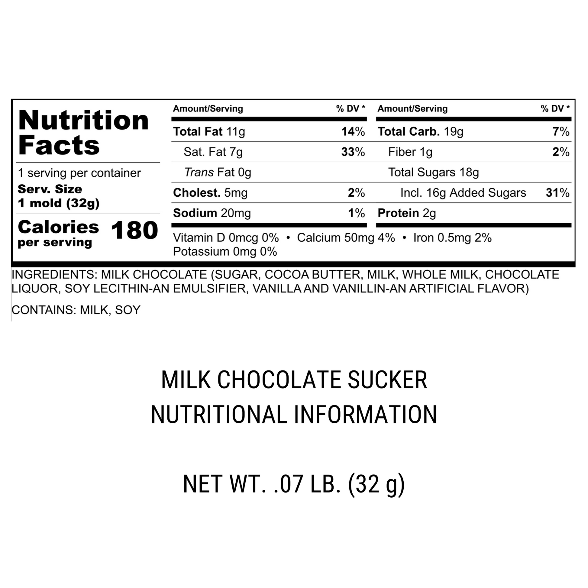 These solid milk chocolate suckers weigh .07 lb. and are 1.5" x 2.5" in size.