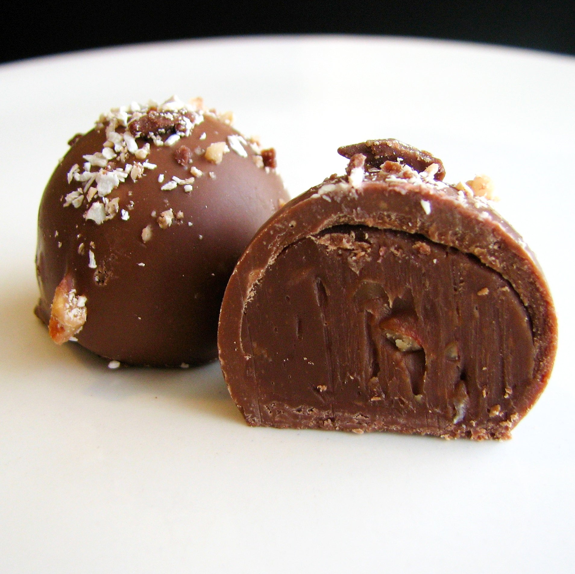 This seasonal milk chocolate truffle has a sweet chocolate center with bits of almond toffee and coconut mixed throughout. These truffles are topped with coconut and toffee bits.