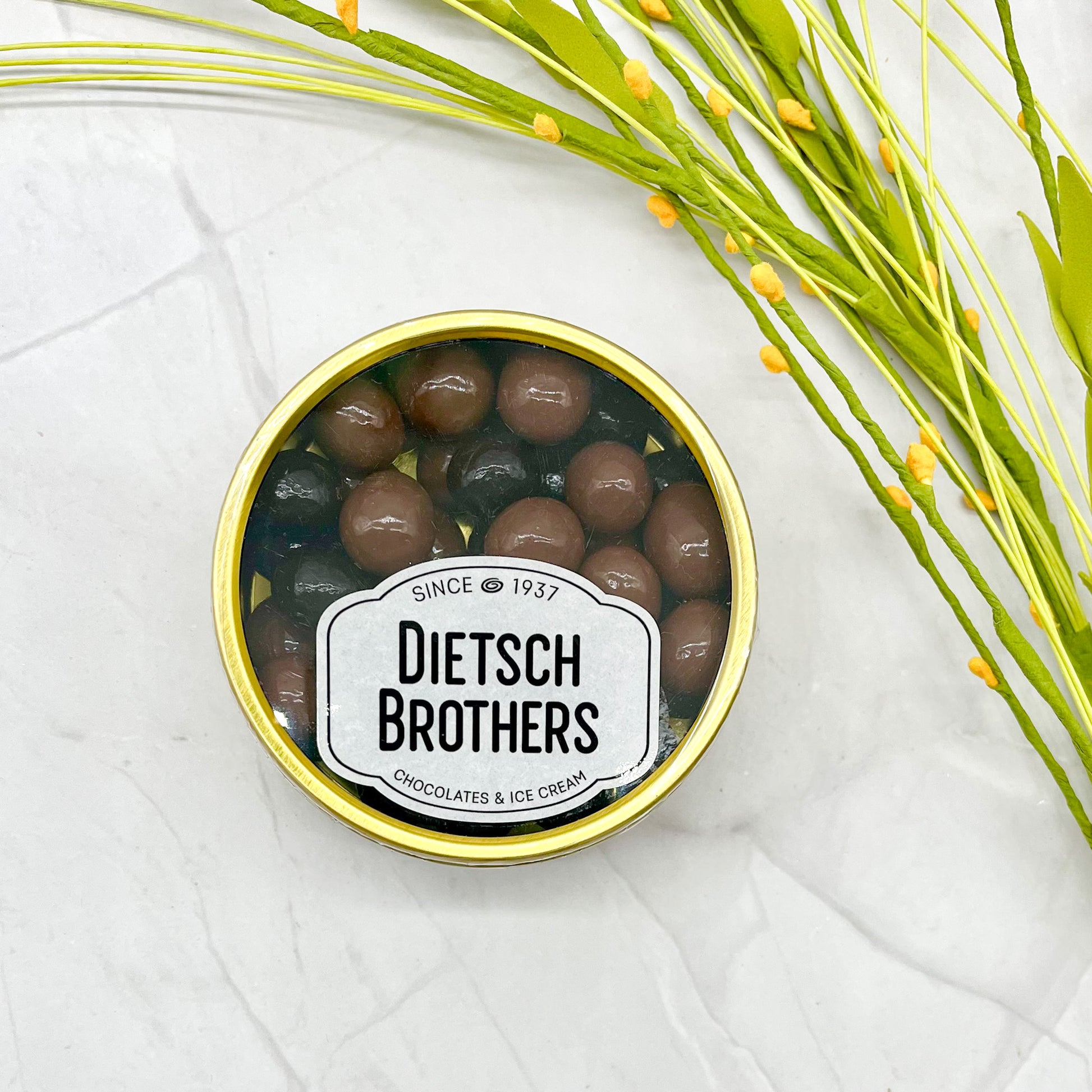 These new petite gold tins are filled with .18 lb. of milk and dark chocolate covered espresso beans. They make the perfect pick-me-up treat or gift for someone.