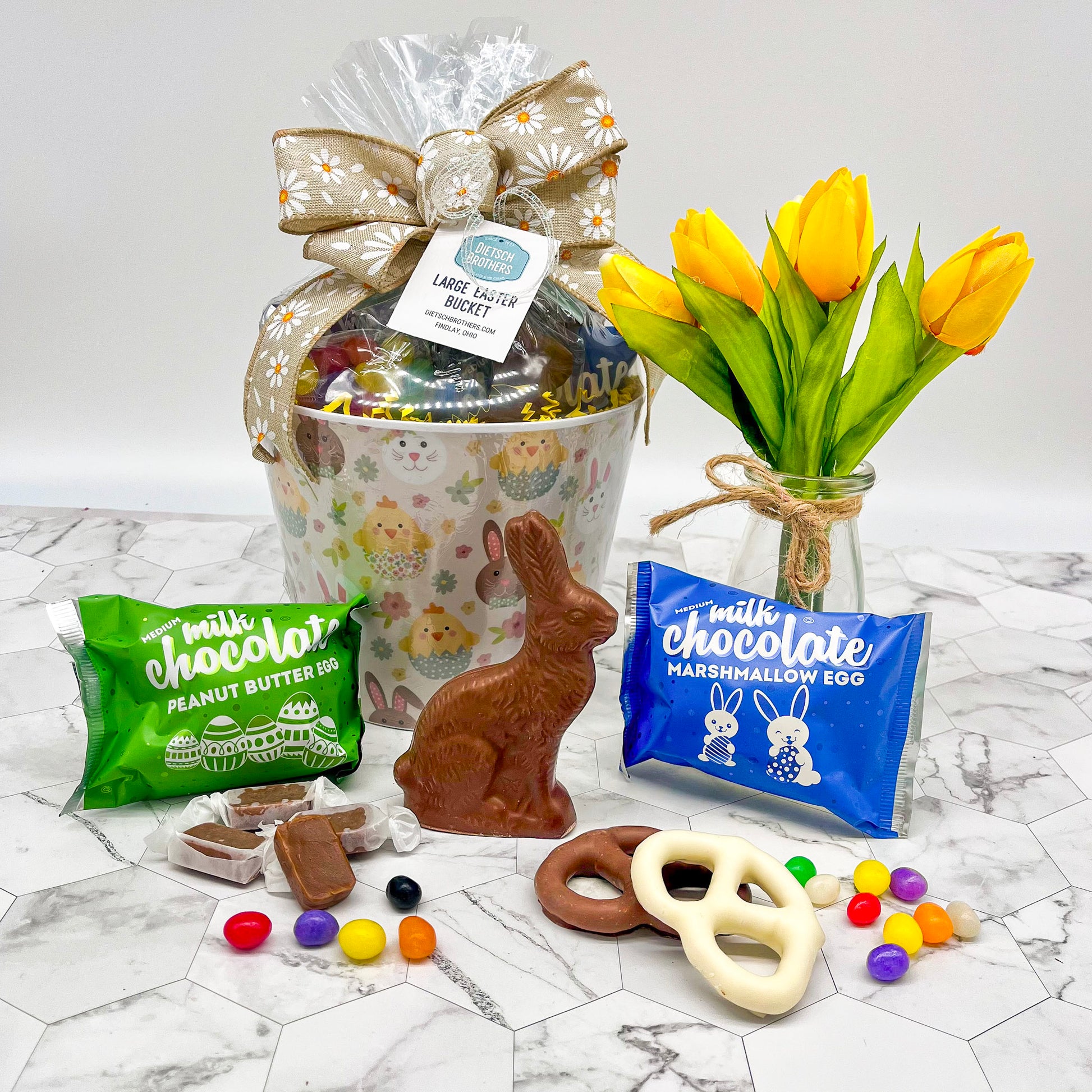 These new, large melamine Easter buckets contain 1/4 lb. jelly beans, three milk and white pretzels, a 4 oz. milk chocolate sitting rabbit mold, ten wrapped caramels, one medium milk peanut butter egg and one medium milk marshmallow egg.