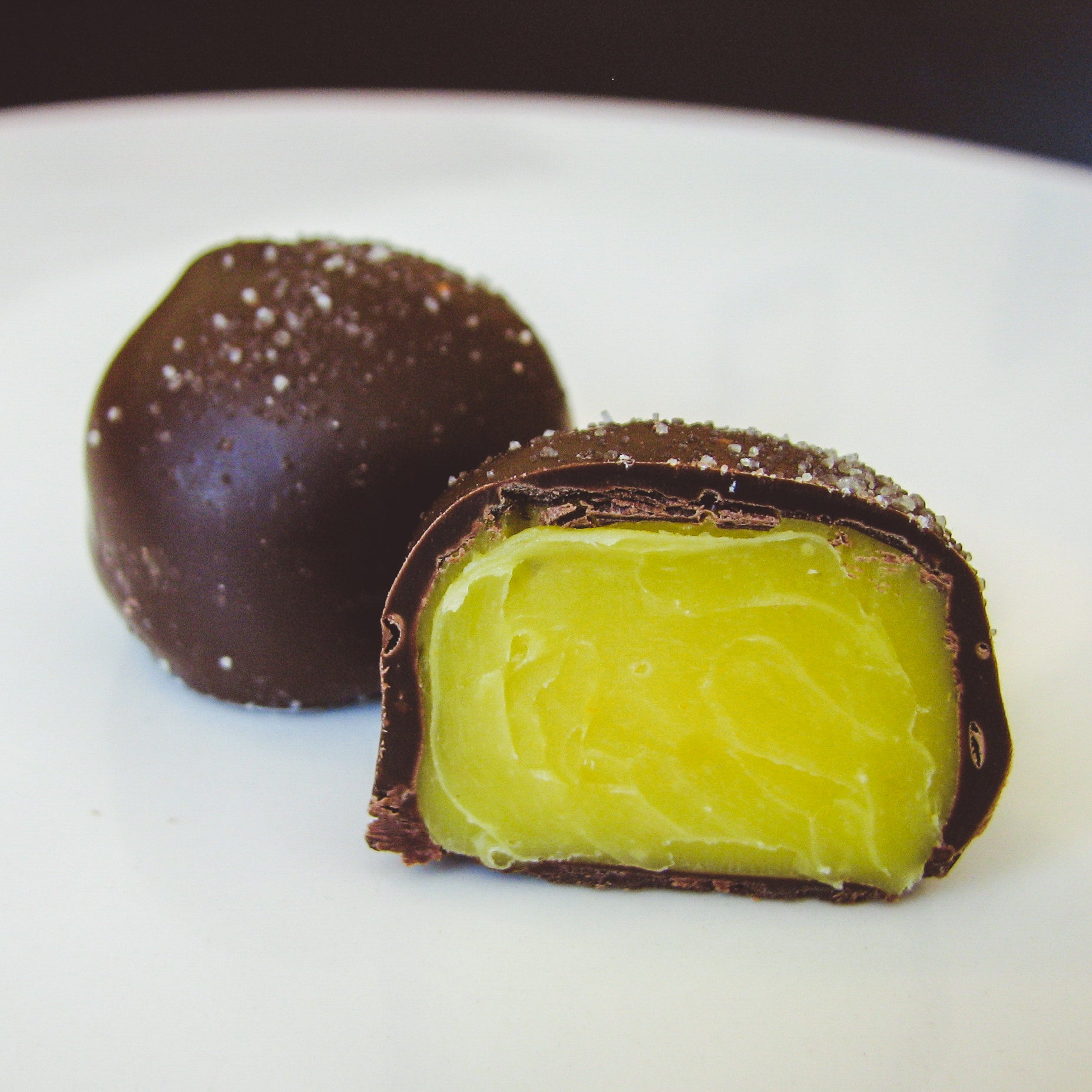 This summertime dark chocolate truffle has a lemon cream pie flavored filling and is sprinkled on top with a little lemonade powder.