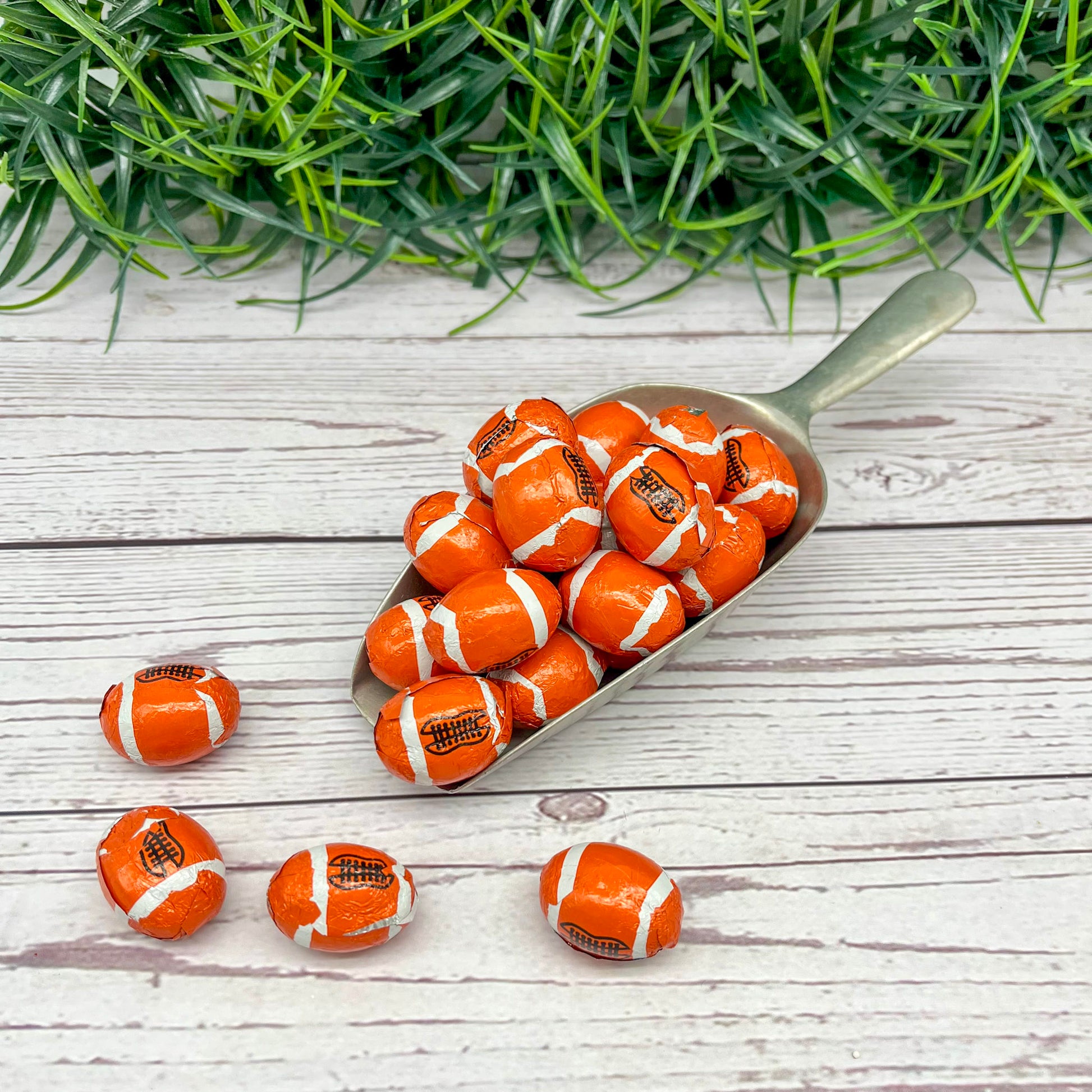 These foil wrapped candies are filled with solid milk chocolate. There are about 63 balls per pound. These make a treat for any football player, fan or coach.