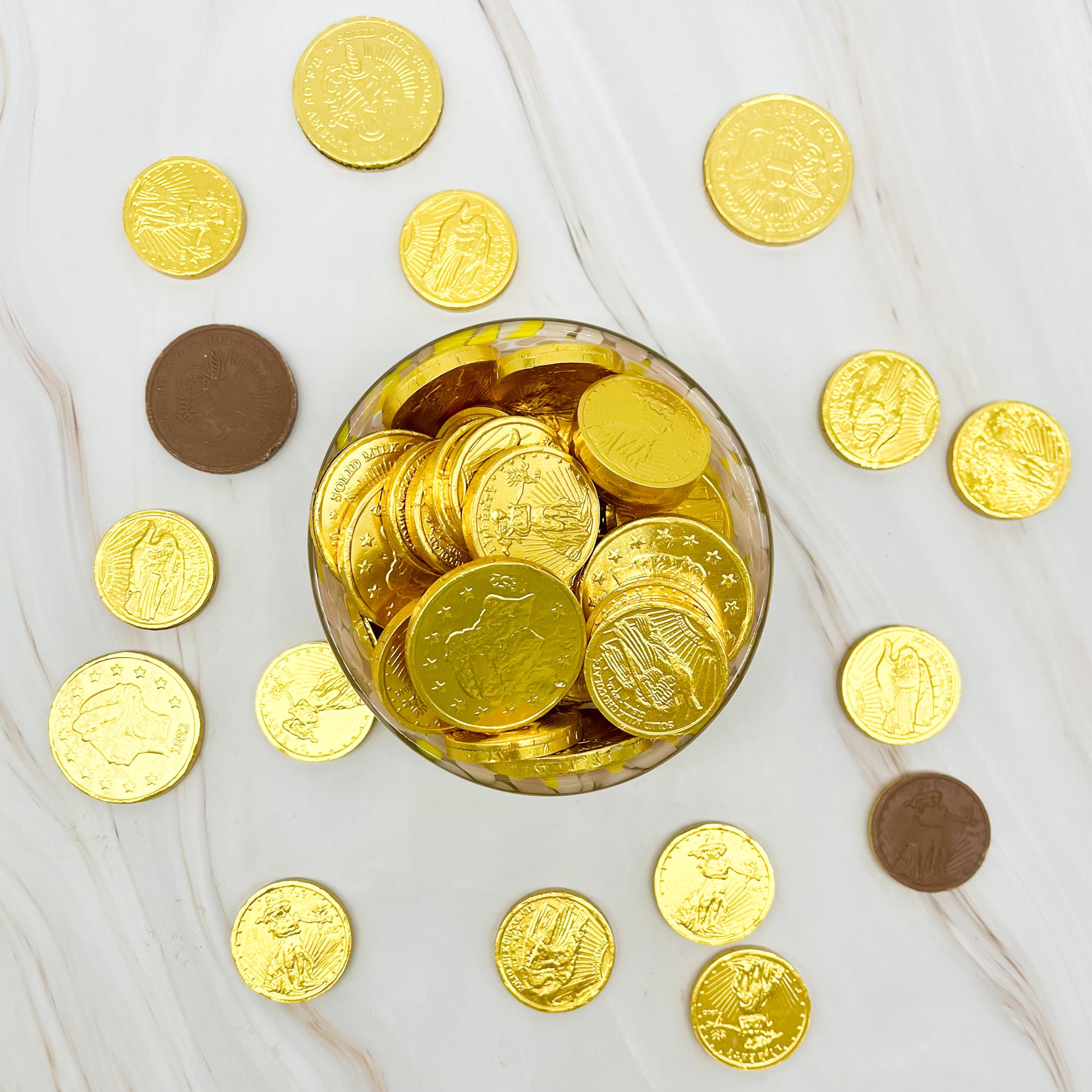 These foil wrapped candies are filled with solid milk chocolate and come in two sizes. A great treat to enjoy or give to someone special. There are approximately 93 coins, an assortment of medium (quarter size) and large (half dollar size), per pound.