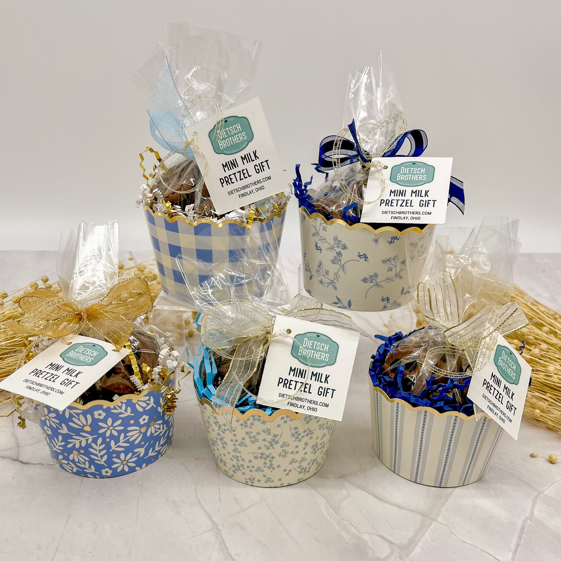 These decorative cups contain 1/4 lb. of milk chocolate covered mini pretzels.