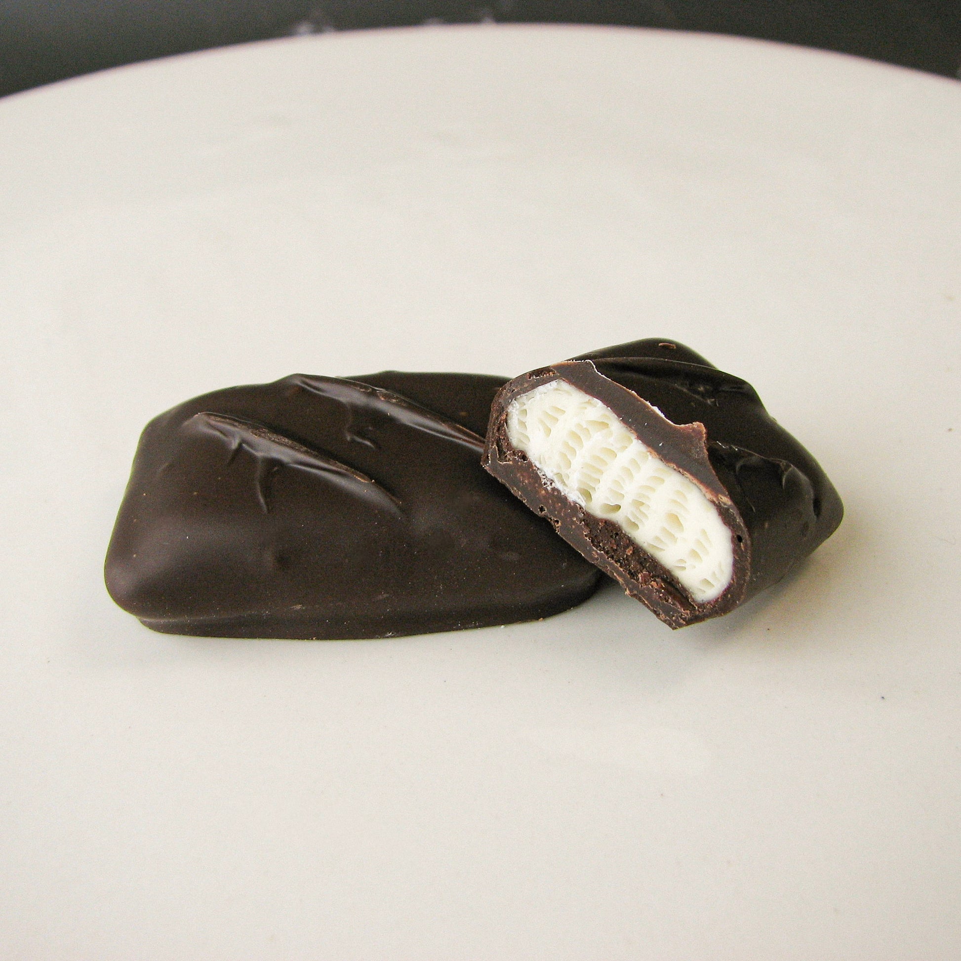 This slim rectangular shaped piece has two lines across the top and has a hard candy center that tastes like peppermint. It's available with a white confectionery or dark chocolate coating.