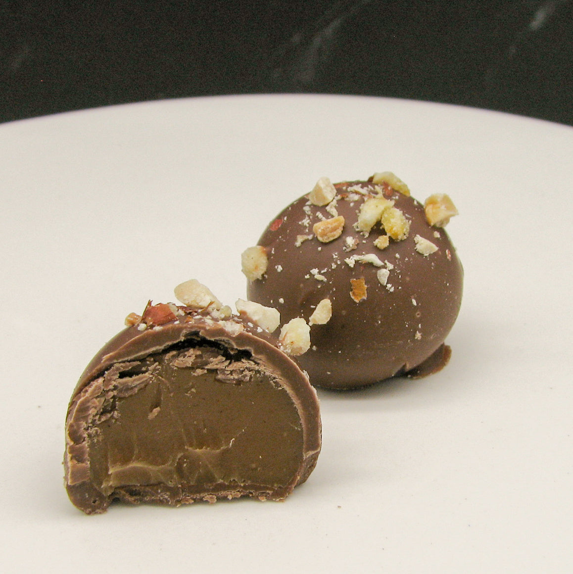 These peanut butter centers are flavored with banana and are topped with crushed peanuts and banana chips after they are coated in milk chocolate.