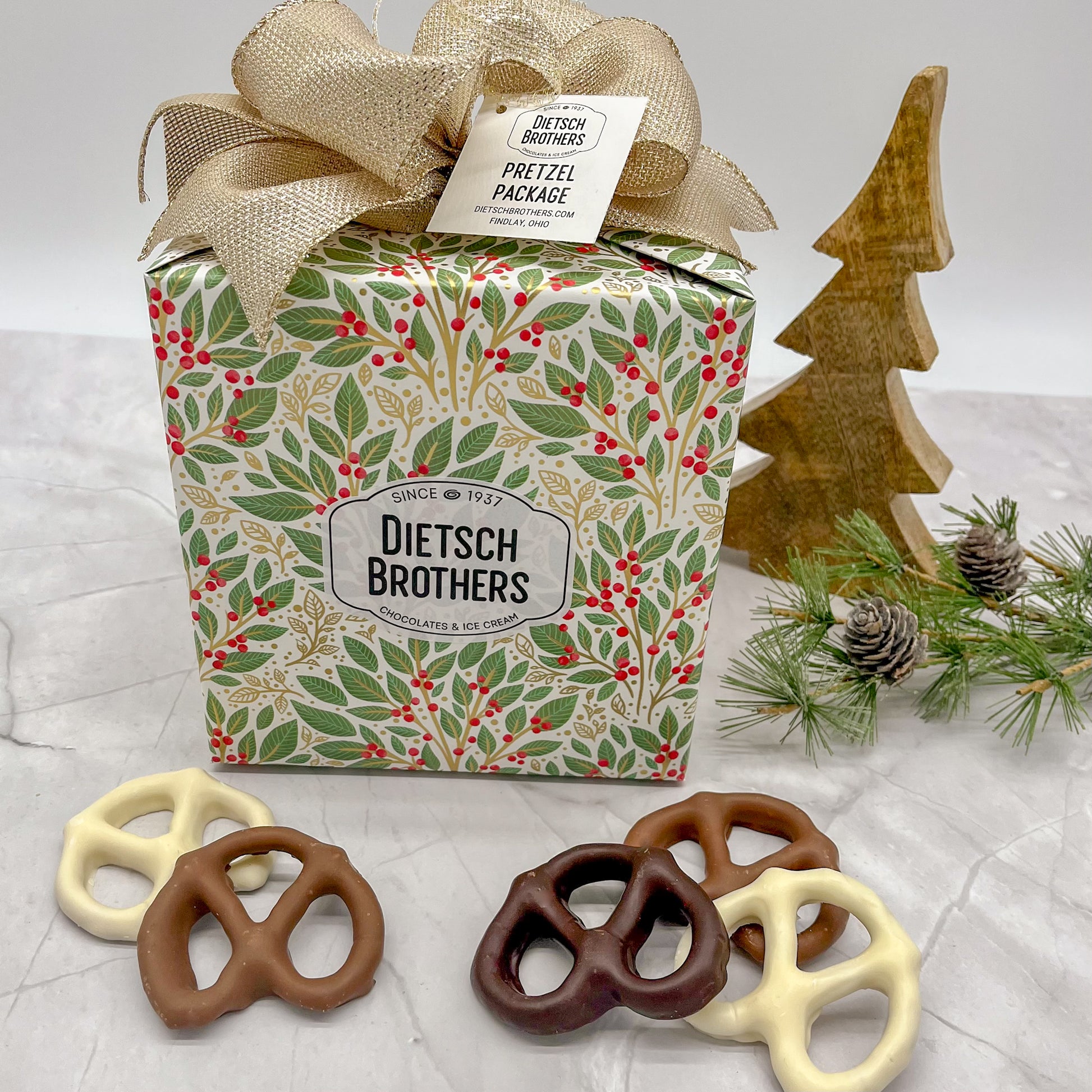 This gift tower contains two 1/2 lb. boxes of milk chocolate pretzels, a 1/2 lb. box of dark chocolate pretzels and a 1/2 lb. box of white frosted pretzels. Gift wrap may vary from picture shown below.