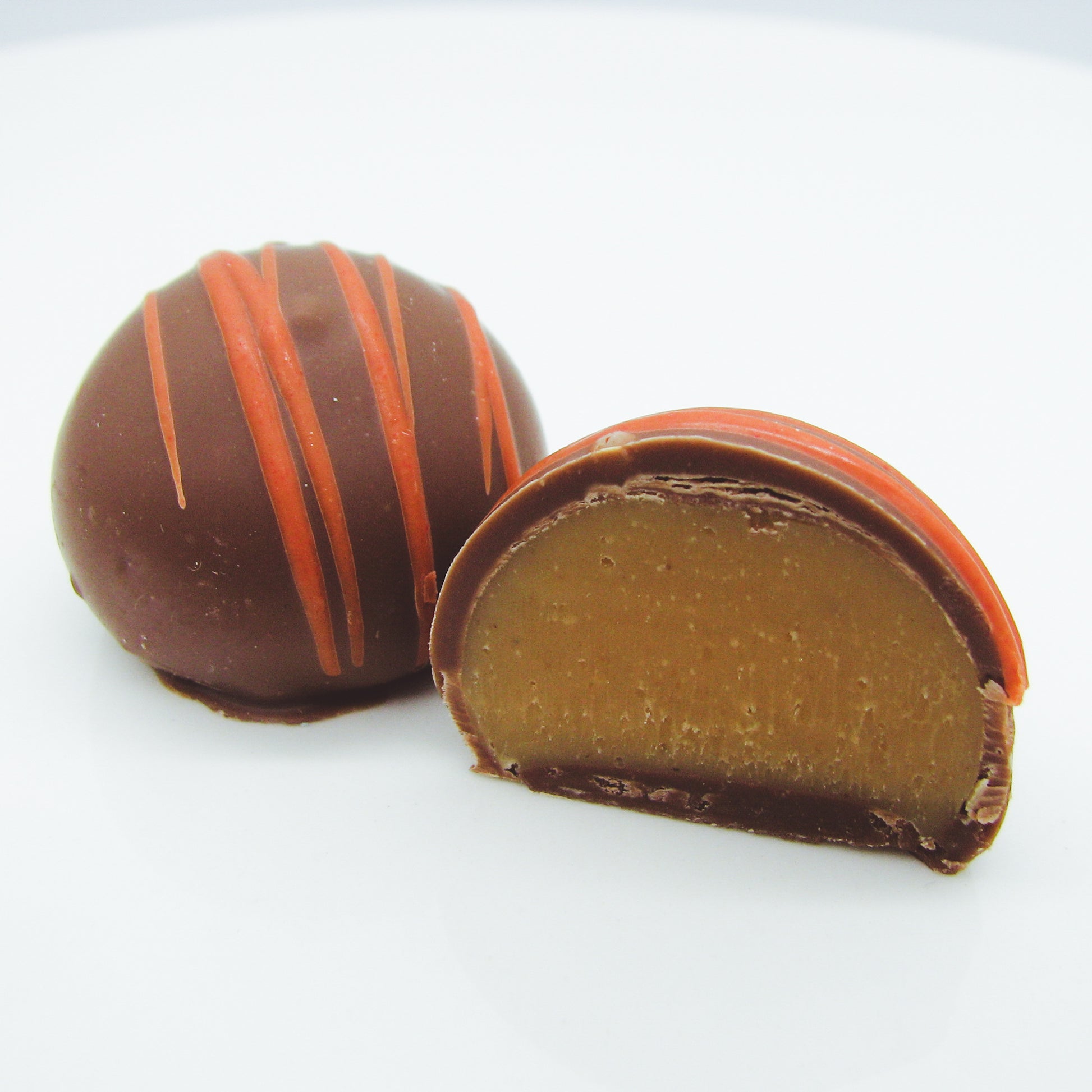 This seasonal truffle features a pumpkin spice center that is coated in creamy milk chocolate and drizzled with orange coating.