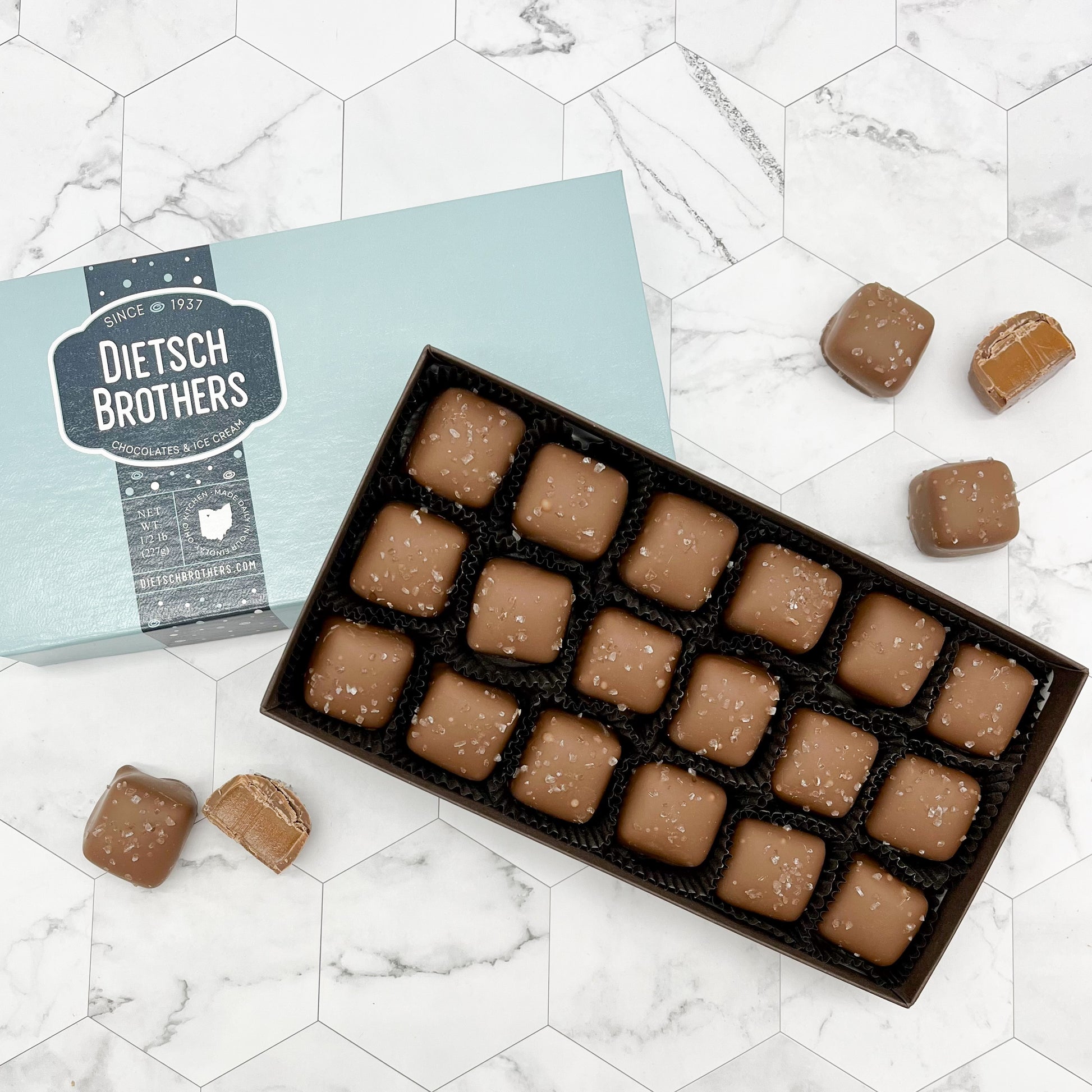 We start with a fresh batch of caramel cooked in one of our copper kettles. After it cools and is cut up into bite-size pieces, we coat each piece in creamy milk or dark chocolate and sprinkle course Sea Salt on top.