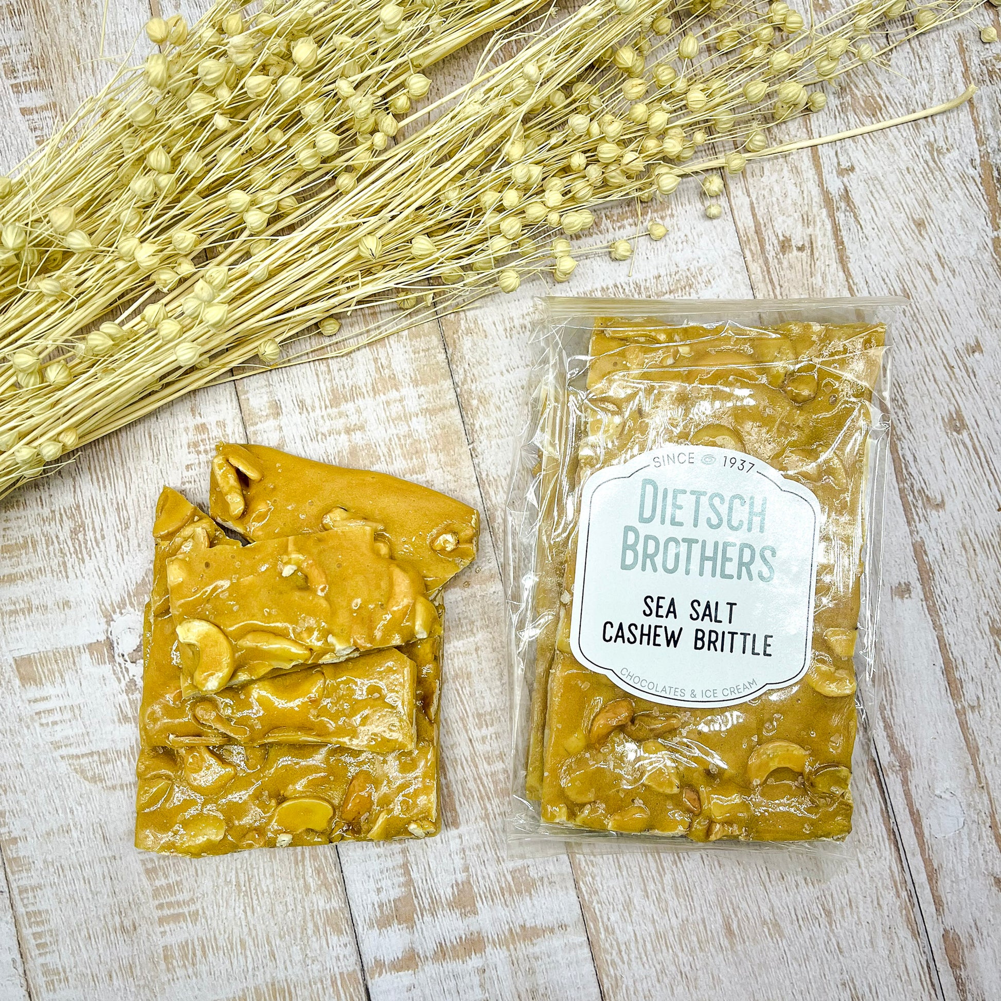 This seasonal treat is available from now through Christmas. Our cashew brittle has a cashew pieces throughout it and is sprinkled with coarse sea salt.