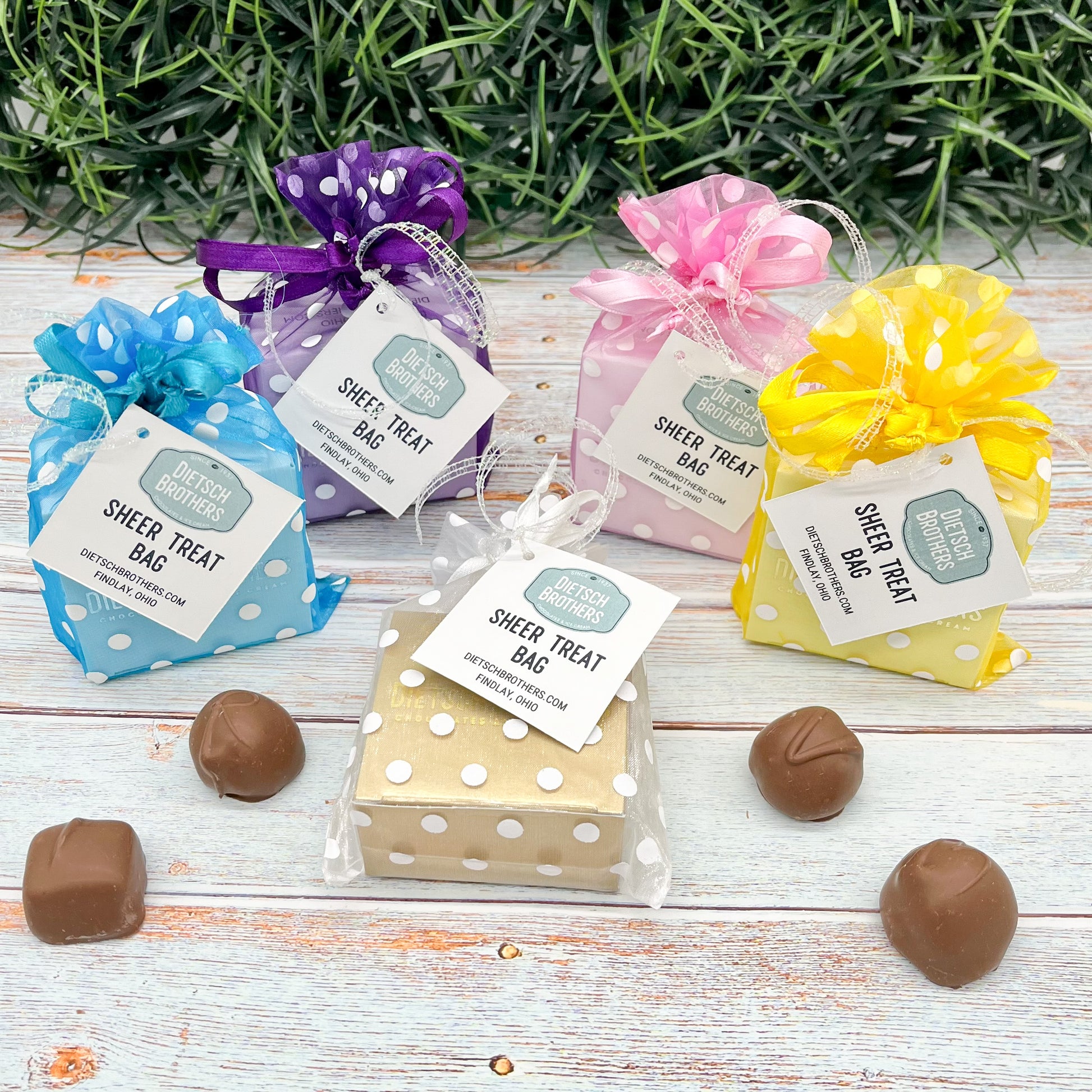 This sheer gift bag is filled with a four piece box of chocolates. Each box contains a vanilla, maple and raspberry cream as well as a caramel that are all coated in milk chocolate.