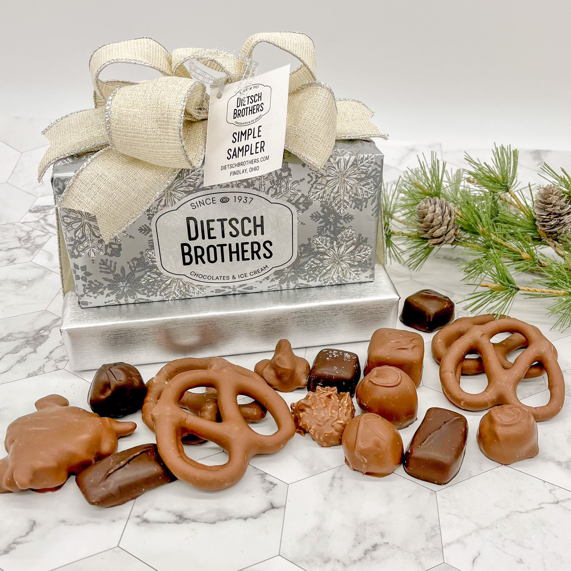 This gift tower contains a 1/2 lb. box of assorted chocolates and 1/2 lb. box of milk chocolate pretzels. Gift wrap may vary from picture shown below.