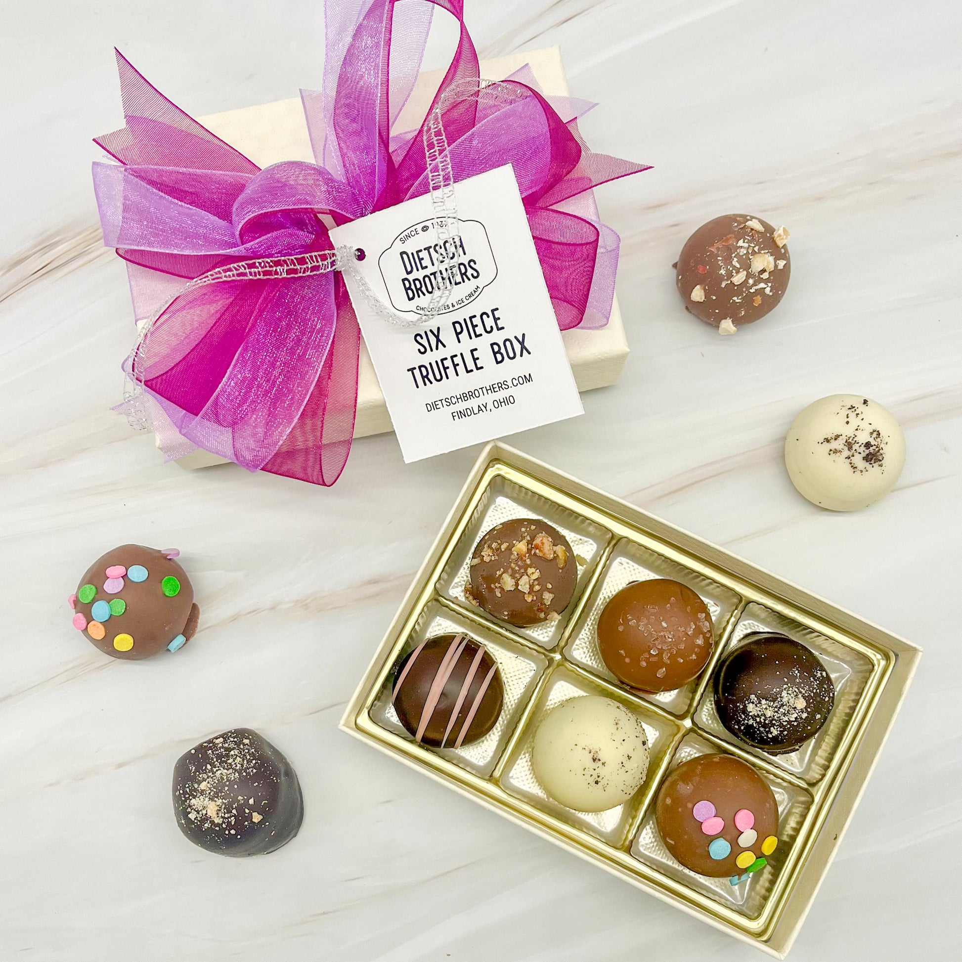 These beautiful boxes include these six truffles: Milk Chocolate Birthday Cake, White Frosted Cookies & Cream, Dark Chocolate Raspberry, Dark Chocolate Cheesecake, Milk Chocolate Salty Caramel and Milk Chocolate Peanut Butter Banana. Each box is hand tied with shimmery fabric ribbon and makes a wonderfully decadent gift.