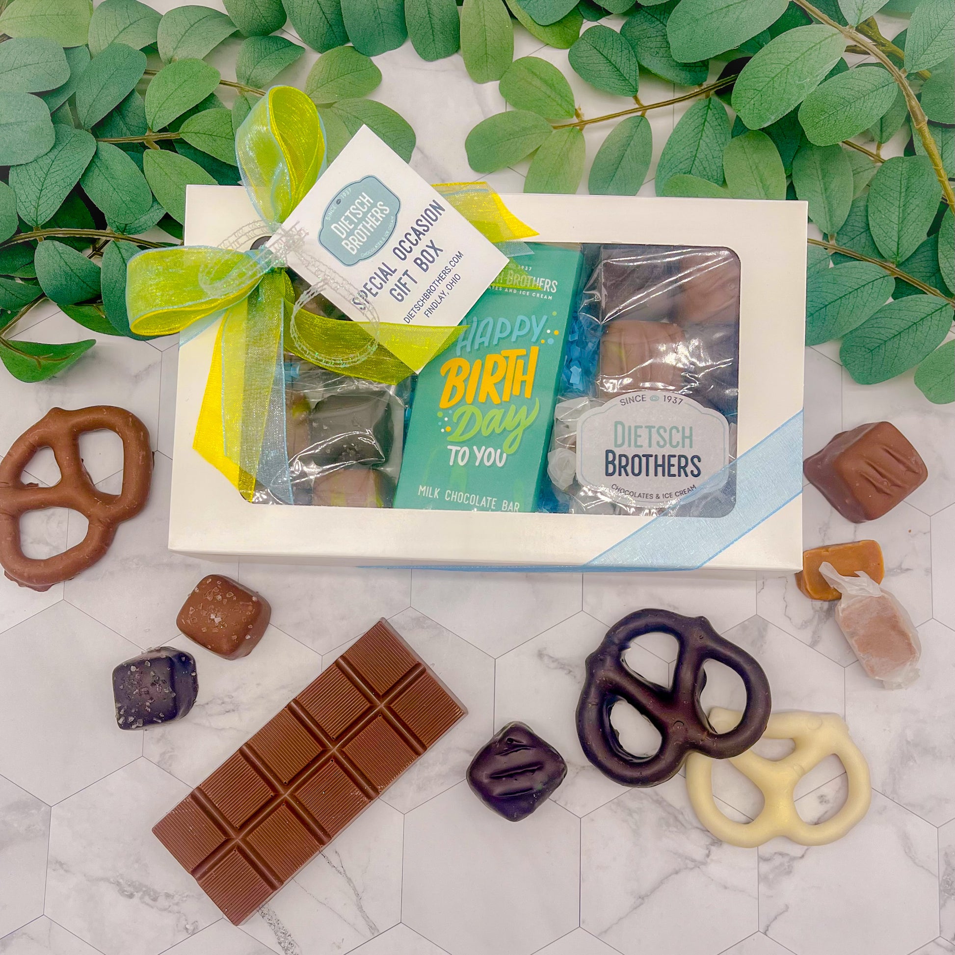 These gift boxes are filled with some of our most popular items and are perfect for any occasion. Each box includes two milk and dark sea salt caramels, two milk and dark peanut butter meltaways, one milk, white and dark pretzel, ten wrapped caramels and a milk chocolate wrapped bar.