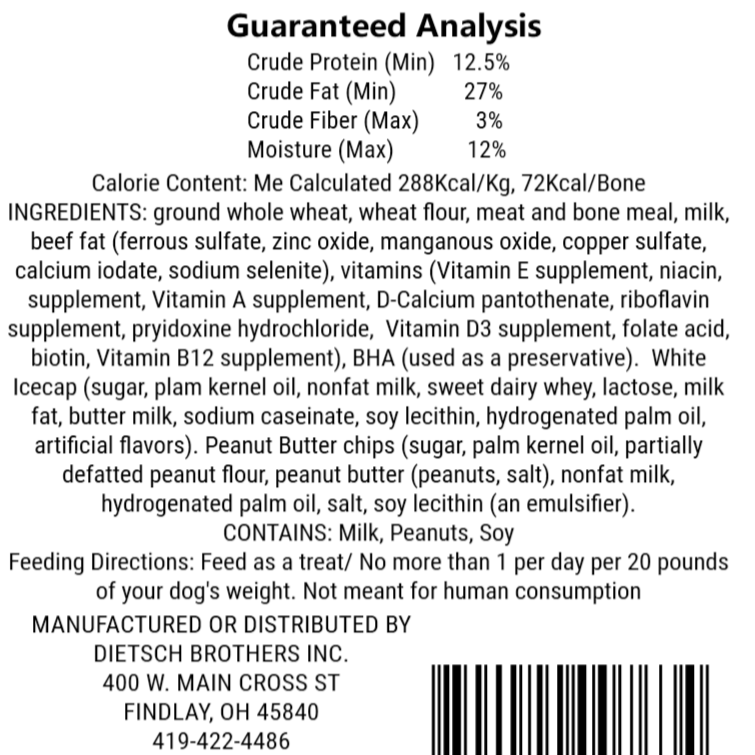 Why not treat your favorite four-legged friend to a Dietsch Brothers treat too? We've taken Milk-Bone dog biscuits and dipped them white confectionary coating and peanut butter coating to create these doggie treats*.