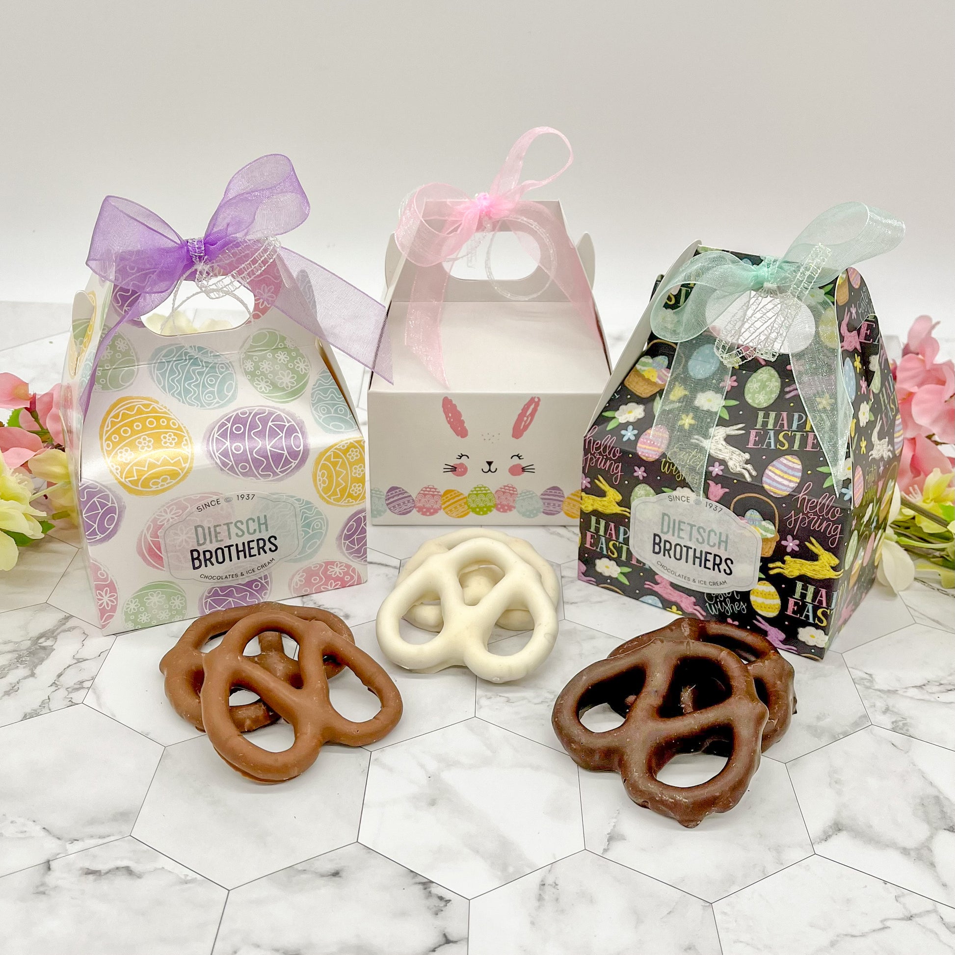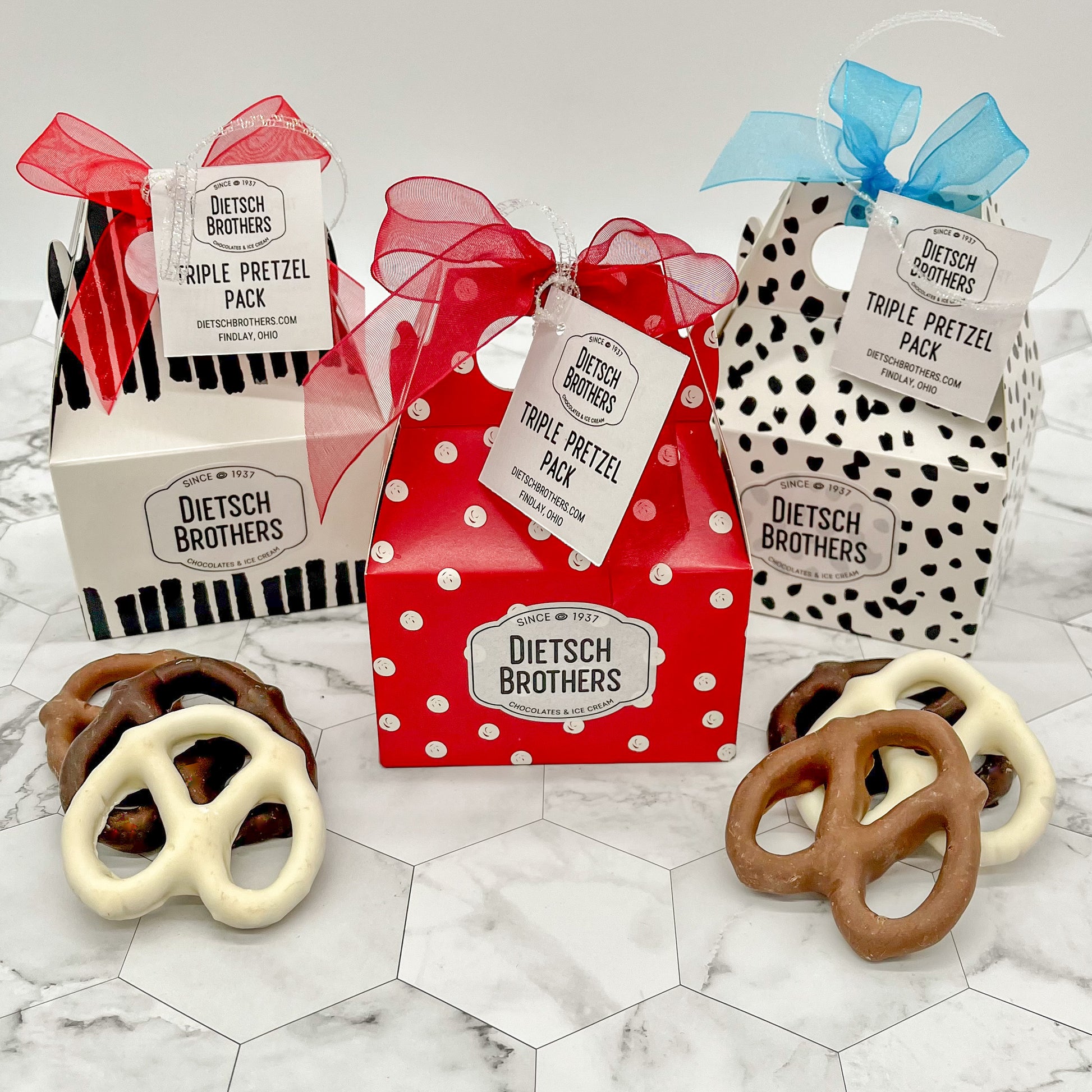 These cute mini gable boxes contain two milk, white and dark chocolate covered pretzels. Packaging may vary from the picture shown.