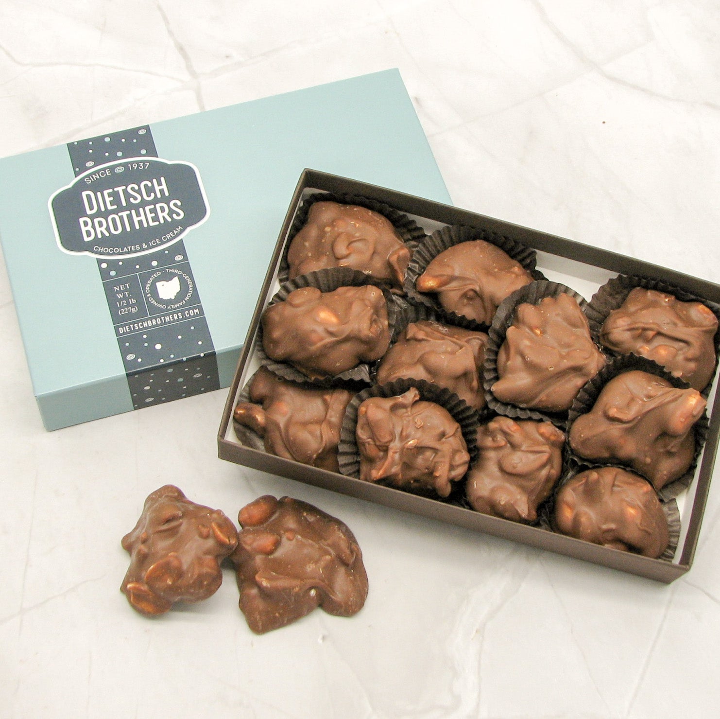 This popular item features our homemade vanilla creams covered in a mixture of fresh blanched peanuts and chocolate.
