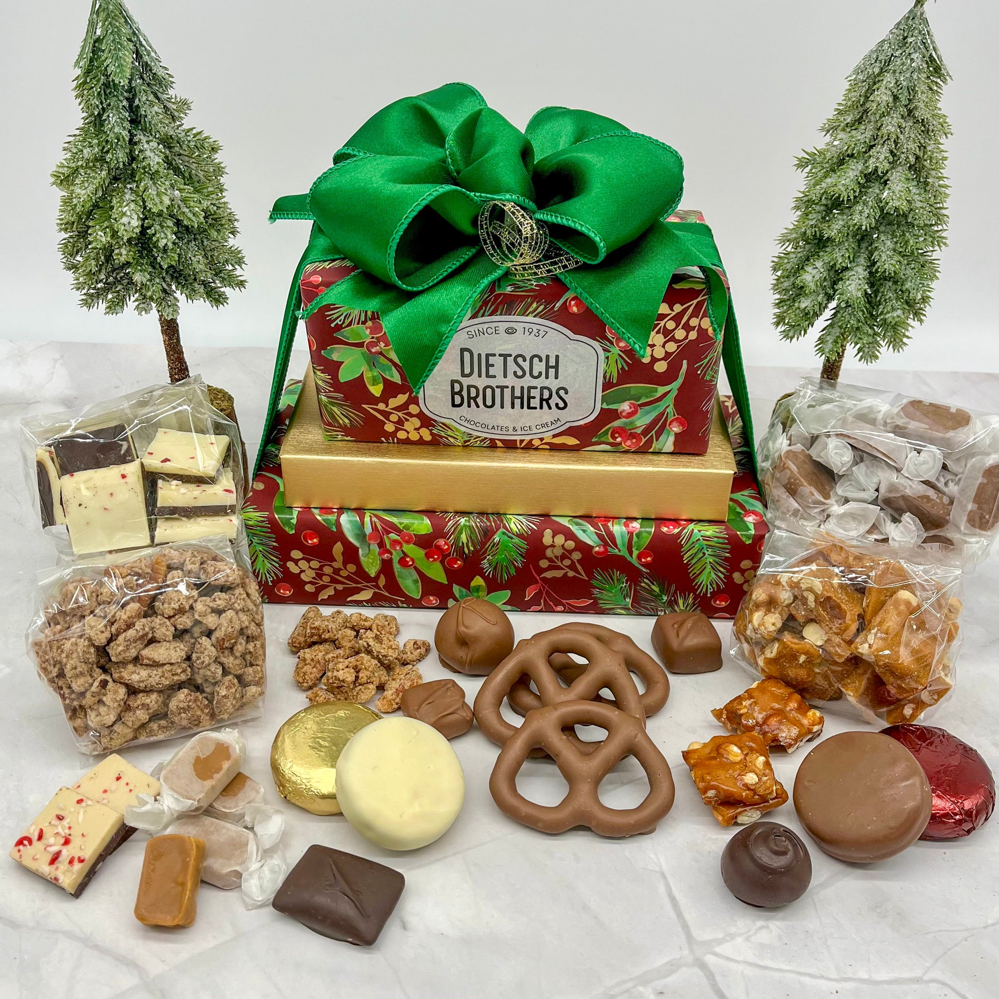 This new seasonal gift tower contains a box filled with: 1/4 lb. bag of peanut brittle squares, 1/4 lb. bag of candy cane bark squares, 1/4 lb. bag of wrapped caramels, 1/4 lb. bag of cinnamon pecan crunchies and one milk and white covered Oreo cookie. On top of that box is a 1/2 lb. box of our assorted chocolates and a 1/2 lb box of milk chocolate pretzels. Each tower is gift wrapped in festive paper and tied with a fabric bow.